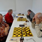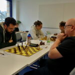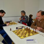A my? Proti očekávání bojovně, statečně, ba dokonce na chvíli ve vedení! Na třetí totiž Jirka Píše uvítal pozdě příchozího též Jirku (Doseděla) nátlakovou hrou, která už za hranicí 20. tahu vedla k úplně bezperspektivní pozici. Pak se téměř hodinu hrálo, měl jsem při všech starostech s vlastní pozicí ostatní za vyrovnané, ale Tomáš už dlouho pohřešoval figuru, až po 40. tahu uznal porážku – srovnáno. Po třech hodinách zodpovědné přetahovačky jsem pak já remizoval s Jirkou Koskem, zakrátko byl v koncovce definitivně pozičně umačkán Vojta (13.15). O hodně méně tahů, ale se nakonec se stejným výsledkem vykonal Petr na čtvrté (13.30) a před 14. hodinou v bojovném duelu podlehl Vítek a naopak fantasticky skóroval Michal. Zbývala nejdelší partie dne, kterou si od nadějného začátku až do trpké nuly ve 14.40 odmakal Martin.