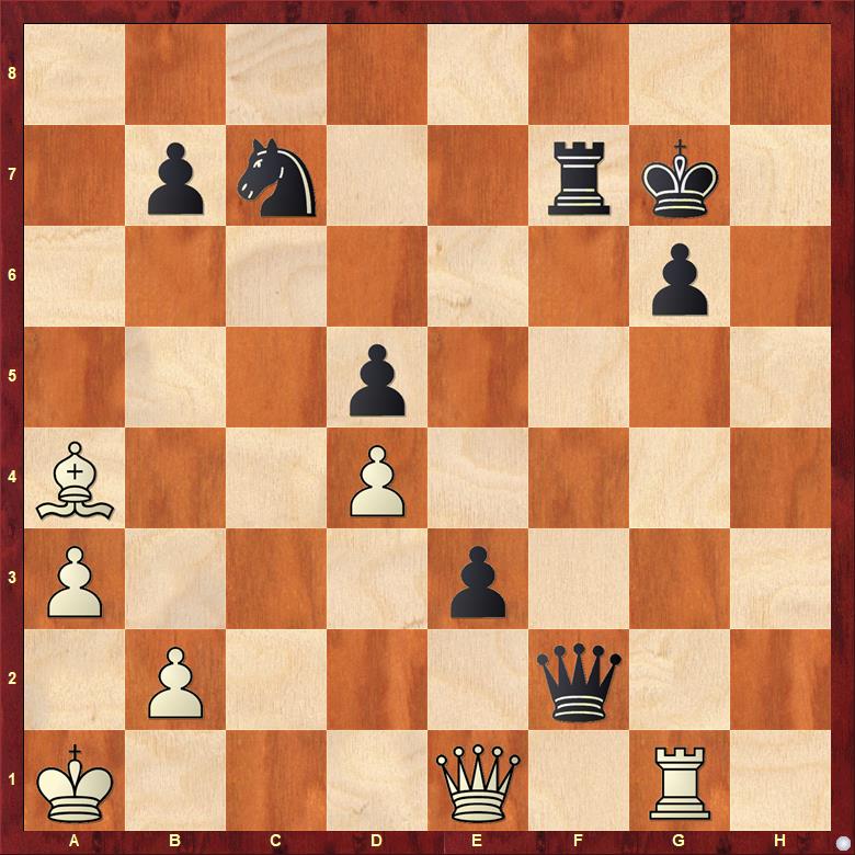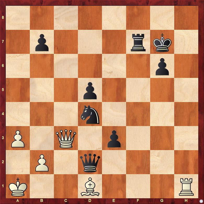 Tady ale našel pěknou protihru 35. Dc8! s hrozbou matu na h8, takže černý musel 35. ... Vf8 36. Dd7+ Vf7 s opakováním pozice. 1/2