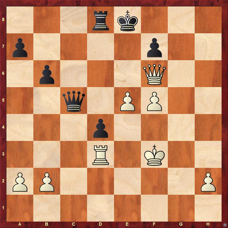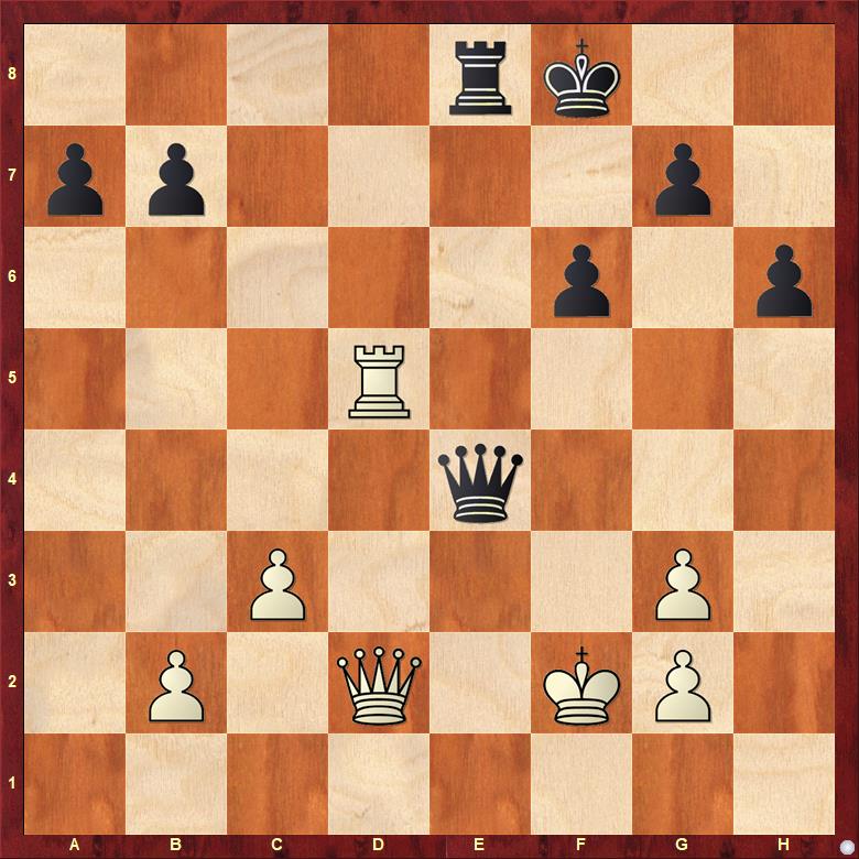 41. … Dd5+? Bylo třeba držet dámu na c sloupci (Dc1, Dc2 nebo Dc4) 42. Kf4 Dxa2?? To je úplně mimo hru. 43. e6 fxe6 44. fxe6 Vd6 45. Df7+ Kd8 46. e7+ Bílý si buď dobere dámu na a2, nebo si i postaví další s rychlým matem. 1:0