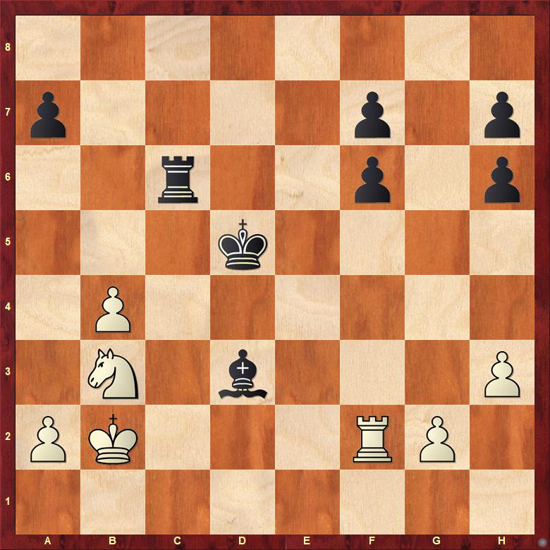 V pozici diagramu jsem zahrál 37. … f5?? a těšil jsem se, že konečně odpoutám věžku od obrany šesté řady. Jenže přišlo a tempo 38. Vd2! a partie je na ručník, prohrává 38. … Kc4 Ja5+ i 38. … Ke4 Jc5+. Spoustu partií rozhoduje vazba nebo vidlička, já vím, ale tohle byla zrada. 1:0