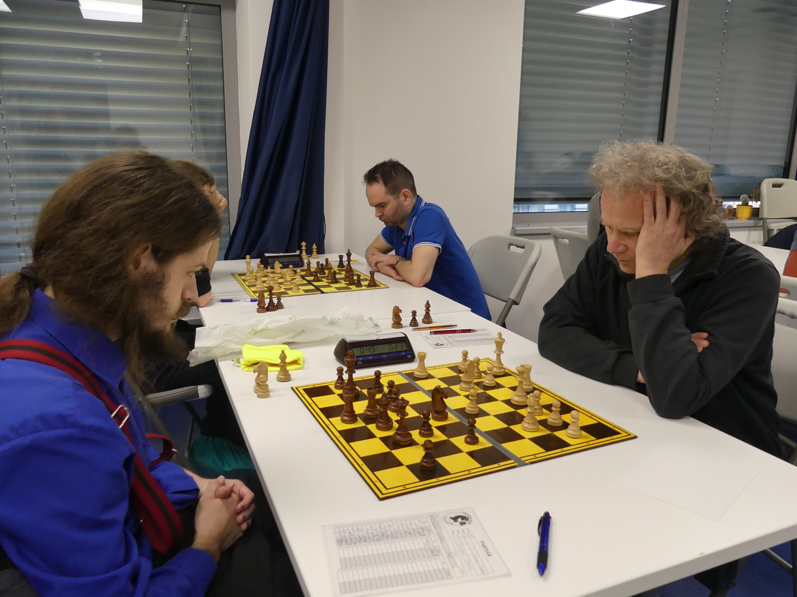Daněk Pavel – Pokorný Jan 1/2 Přes nedlouhý průběh (17 tahů) bylo v partii několik zajímavých momentů. Bílý opět spíš nevhodně utekl z hlavních variant a rozhodně nestál líp, spíš fous hůř. Ve dvou momentech jsem ale nenašel odvahu na razantnější řešení pozice a s výrazně horším časem (půlhodina proti 50 minutám) nabídl plichtu. Kapitán hostí dlouho otálel, skoro tři čtvrtě hodiny zkoumal okolní pozice, než přijal. Ve finále by se mohl snažit akorát černý… pachuť ze zpackaného zápasu mi ale veškerou bojovnost vzala.