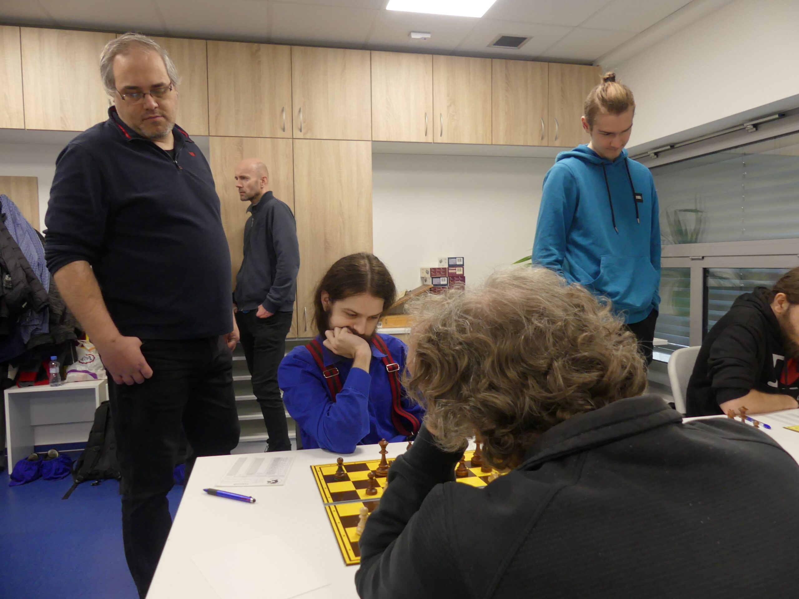 Takže nás podobně jako v derby dost rychle opustila chuť bojovat, celý zápas byl vlastně takový odevzdaný. Na trojce stihl včas zapůlit Zdenda a v podezřelé pozici s poledními zvony Petr. Dvoje bílé pryč, ale těžko něco vyčítat. Pak od začátku zdechlou pozici dotahal Michal, to bylo spíš na provětrání partiáře. Můj soupeř nechal běžet hodiny 50 minut, než přijal Pokymu remízovou ponuku, z pozice kapitána zodpovědně dohlížel na spoluhráče. Jediný čestný úspěch zapsal Jirka, vyrovnání nám ale nevydrželo dlouho. Vojta ještě zodpovědným výkonem vyvzdoroval se silným soupeřem černými půlku, ale starší brácha Vítek byl o fous dřív na první učebnicově rozebrán a poslední končil po 13. hodině Tom, který přitom mohl vzdát už mezi prvními.