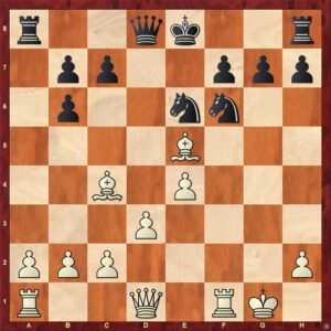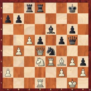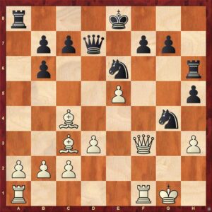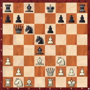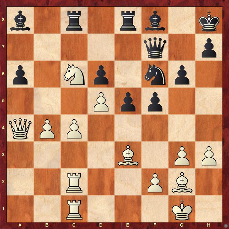 … a tady už černý rezignoval na zachraňování koně, mohl totiž hrát 18. … Vg6! 19. Dxb7 (ne však 19. hxg4? Vxg4+ a věčňák po polích g4-h4!) 19. … Jh6+ 20. Kh2 Vd8 a ještě se nějak držet, ale zahrál jen 18. … 0-0-0? a po 19. hxg4 už šlo jen o to nepustit černého k odkopanému bílému králi. 1:0