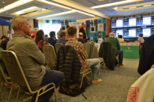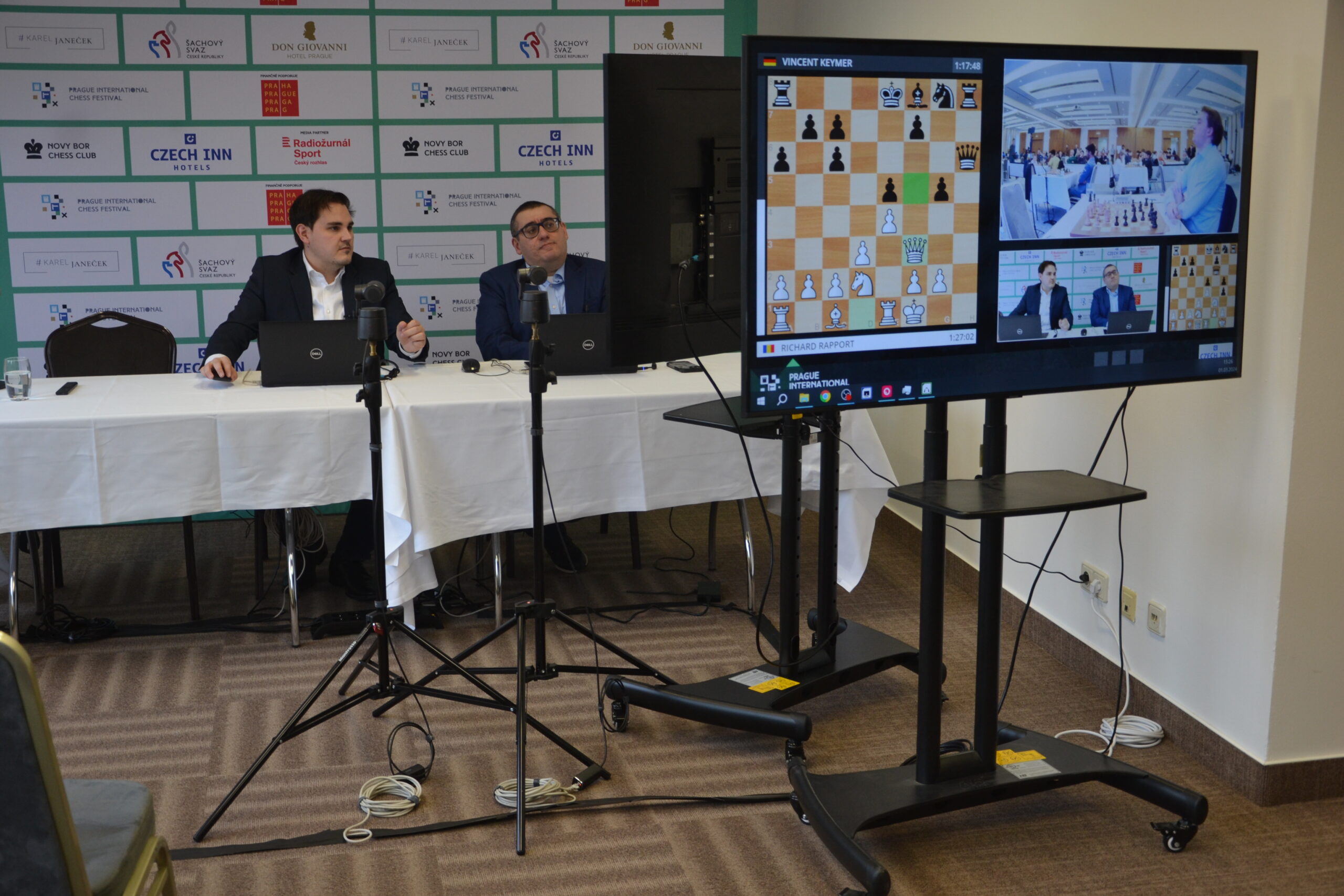 Skuteční moderátoři (vzadu) se nejspíš právě snaží držet krok se svými obrazy na monitoru. Na diagramu prapodivná verze výměnné španělské s časným g5 (Rapport – Keymer).