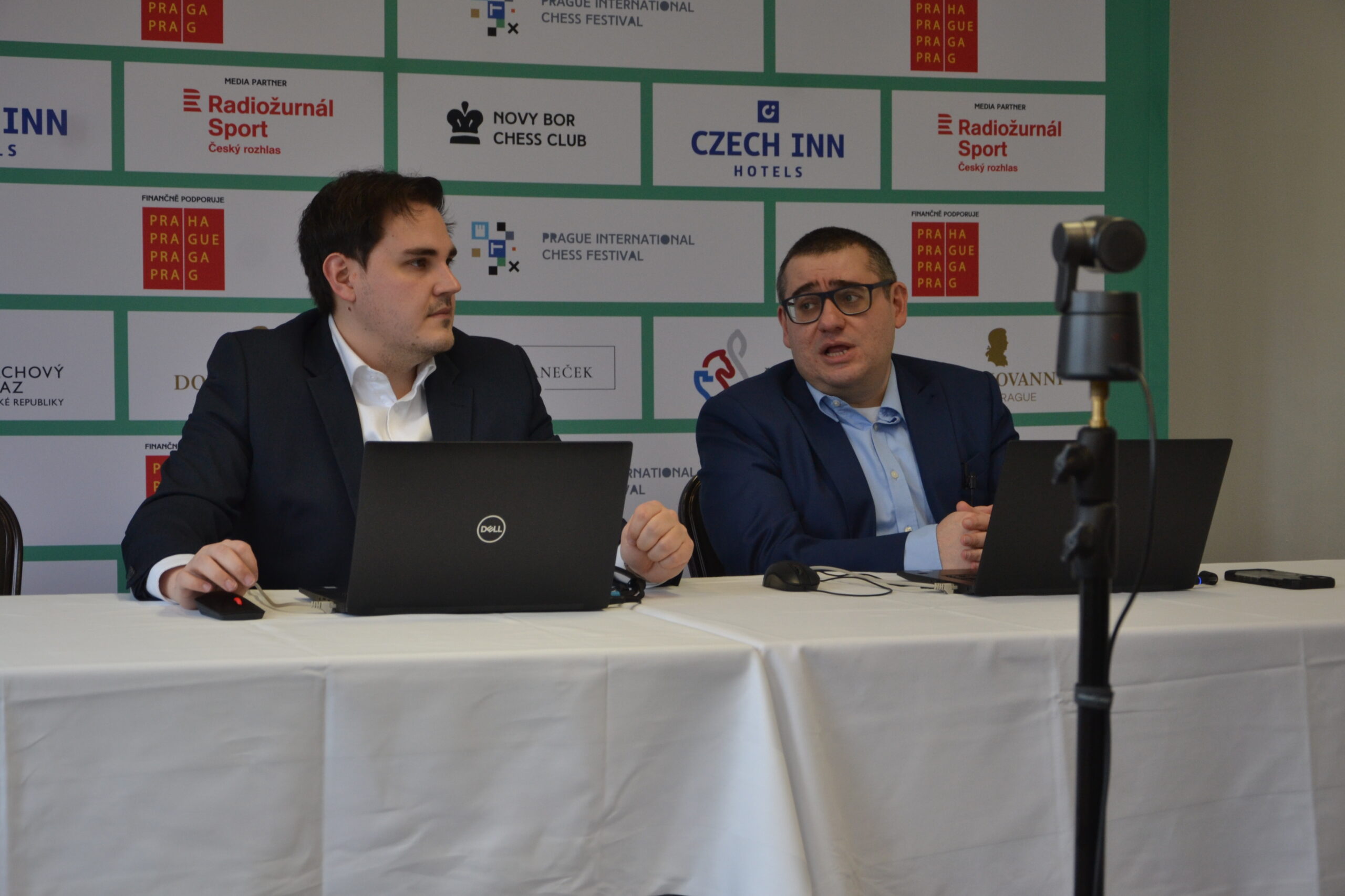 A tady je salónek, odkud jde do éteru televizní vysílání. Jeho stálicí je IM Vlasák (vlevo), toho známe třeba z Harrachova, právě od něj jsem jména Abdusattorov a Praggnanandhaa slyšel poprvé. Jeho hosté se střídají, dnes to byl GM Movsesjan.
