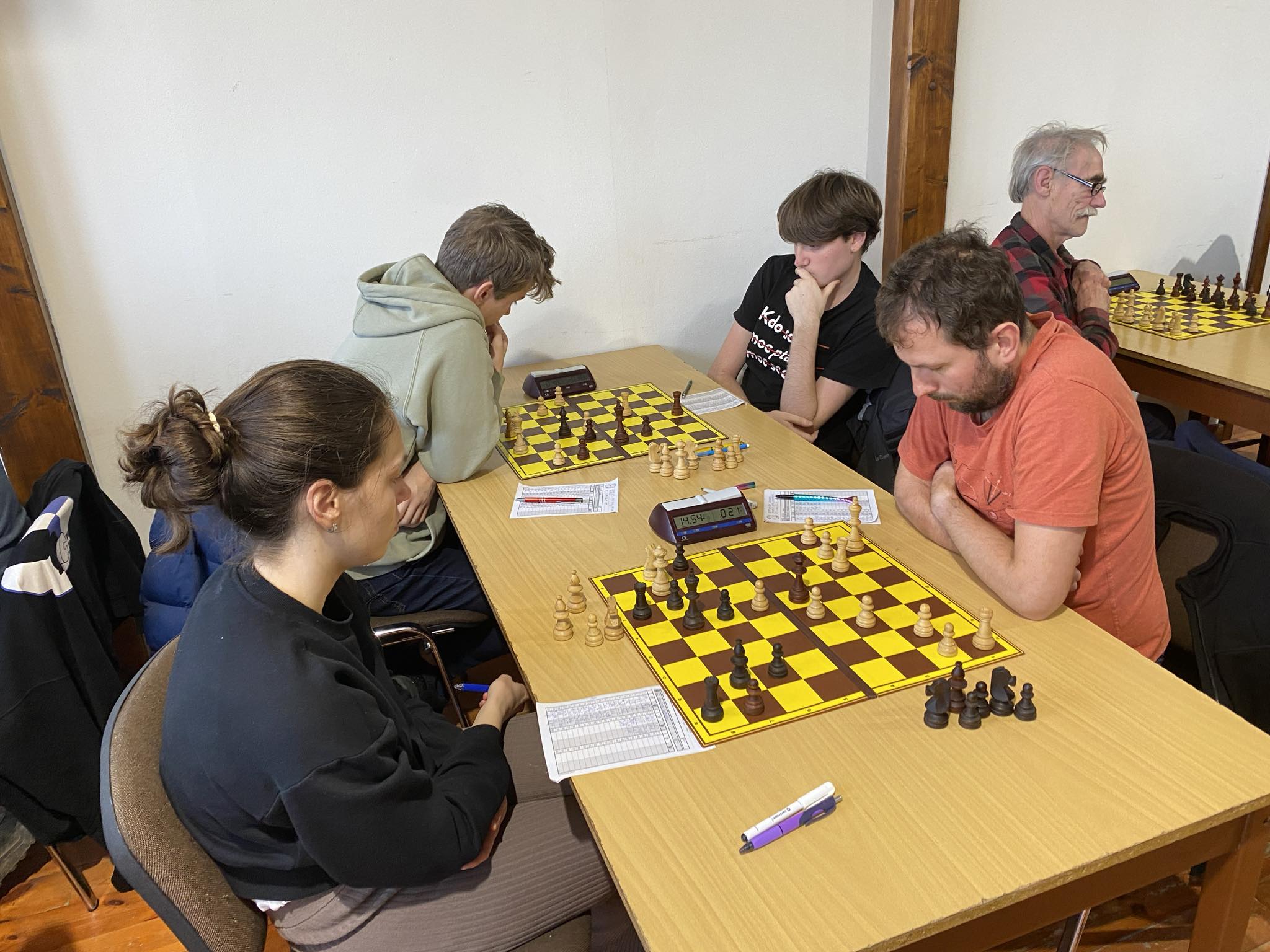 Zato domácí nastoupili opravdu maximálně děraví. Trochu se to dalo čekat, ale ne v té míře, která skutečně nastala. Sice ve mně hrklo, když jsem v hrací místnosti viděl první tři desky (Stoček, Lihotský, Černý), ale ukázalo se, že první dva jmenovaní hrají 1. ligu za Polabiny B (ty těsně prohrály se Starým Městem, byť hosté byli v sedmi, mj. Ruda Jun půlil s GM Babulou), navíc do Brna s Polabinami C odjeli pro zápasovou výhru Trojan a Törvenyi.