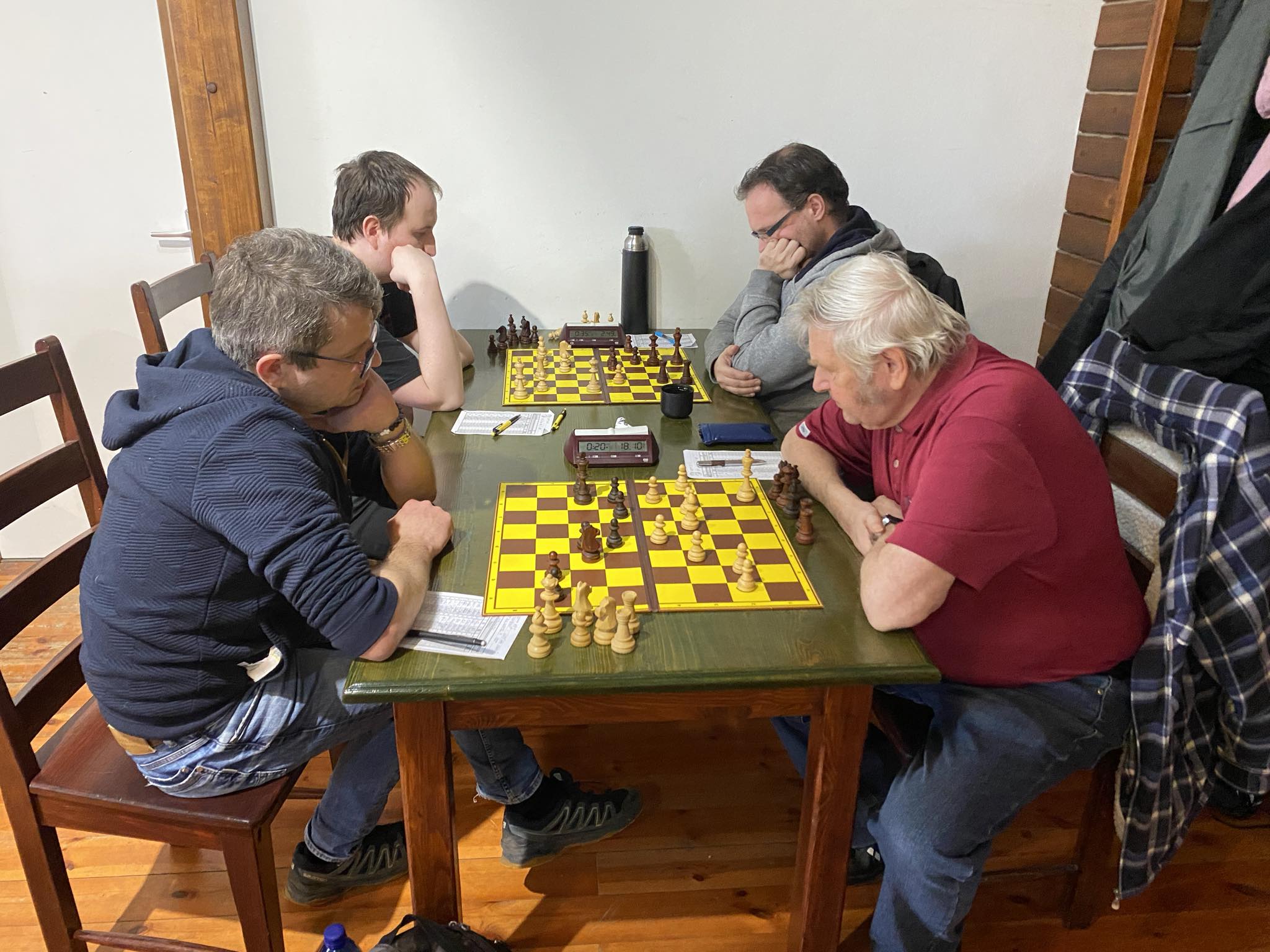 Přesto dlouho nic jasného nebylo. Jasně, zápas to byl bez nervů, dalo se čekat, že i nějakou náhodnou ztrátu v pohodě dorovnáme, ale hrálo se dlouho. Zdravého pěšce měl Ivoš a Kuba, určitě jsem se nebál o Zdeňka, Petra nebo Jardu. Trochu mě mrzela Vaškova pozice, která se dost brzo zploštila a hrozila při nestejnopolácích rychlou remízou. Vašek se položil do hledání aspoň nějakých šancí, ale tím se zase dostal do silné kisny, podobně i vzadu Martin. Soupeř měl zase kisnu na dvojce proti Zdeňkovi, možná i jinde.