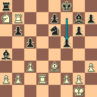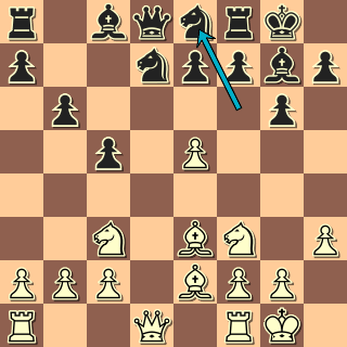 11. … Jc7 12. Vad1 De8 13. Jb5! Černý Jc7 je asi nejlíp stojící figurka; kšá! Měnit černý samozřejmě nesmí, po vazbě na sloupci by se Jd7 dostal pro změnu do vazby diagonální. 13. … Je6 14. Dd5 Teď už ano, když černý nemá Jc7. 14. … Vb8 15. Jxa7