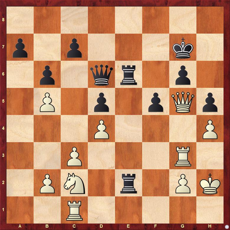 Tady je pozice sama o sobě zajímavá, bílý má figuru, ale čelí aktivitě černých těžkých figur, podle počítače vyhrává jen 1. Kg1!. Mě ale černý zavolal k nepřípustnému tahu 1. Vg3-d3. Ten jsme vrátili, bílému bylo jasné, že musí hrát něčím jiným; a čím teda? Tak třeba dámou … chytil ji do ruky, ale ta hrůza, ona nikam nemůže! (Po braní na f5 nebo h5 přijde Dxg3+!.) Jak to dopadlo, nevím, bílý tam seděl s dámou v ruce ještě dlouho a já odběhl zase k jiné desce, abych rozhodoval další reklamaci dnešní dlouhé soboty.