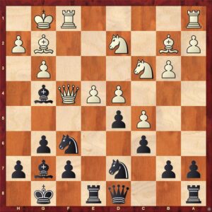 Tady jsem byl spokojen, protože pozici znám, pokud bílý bude hrát na dámském křídle, kde má převahu, můžu spustit figurový útok na královském podle Fischerova vzoru. 12. f3 To charakter pozice mění, ale teď budu mít hru po e sloupci proti slabému pe3. Bílý by neměl být nebezpečný, má špatného černopoláka. 12. … exf3 13. Dxf3 Jb6 14. c5 Sg4 15. Df4 Jbd7 16. e4