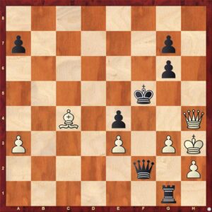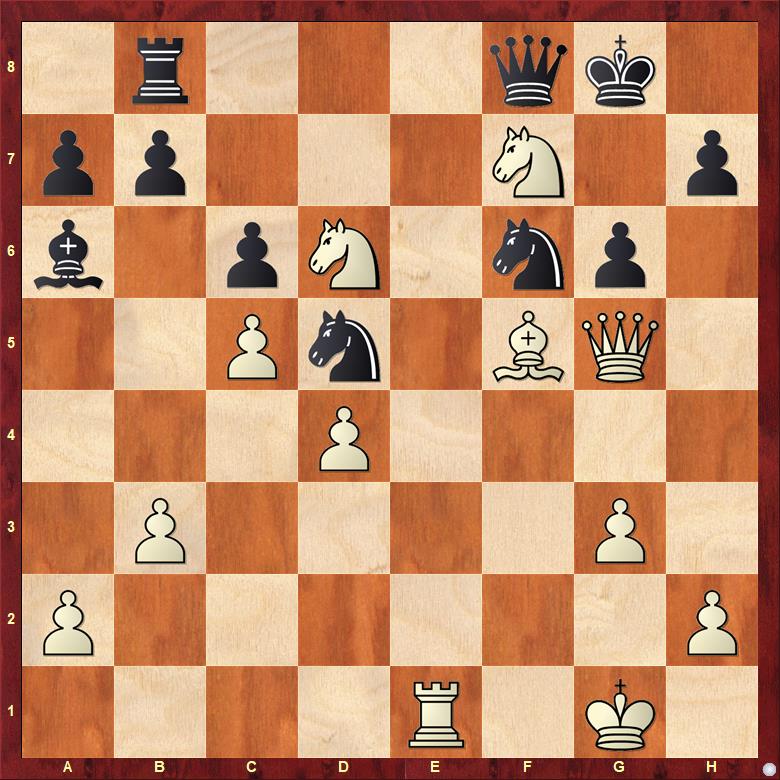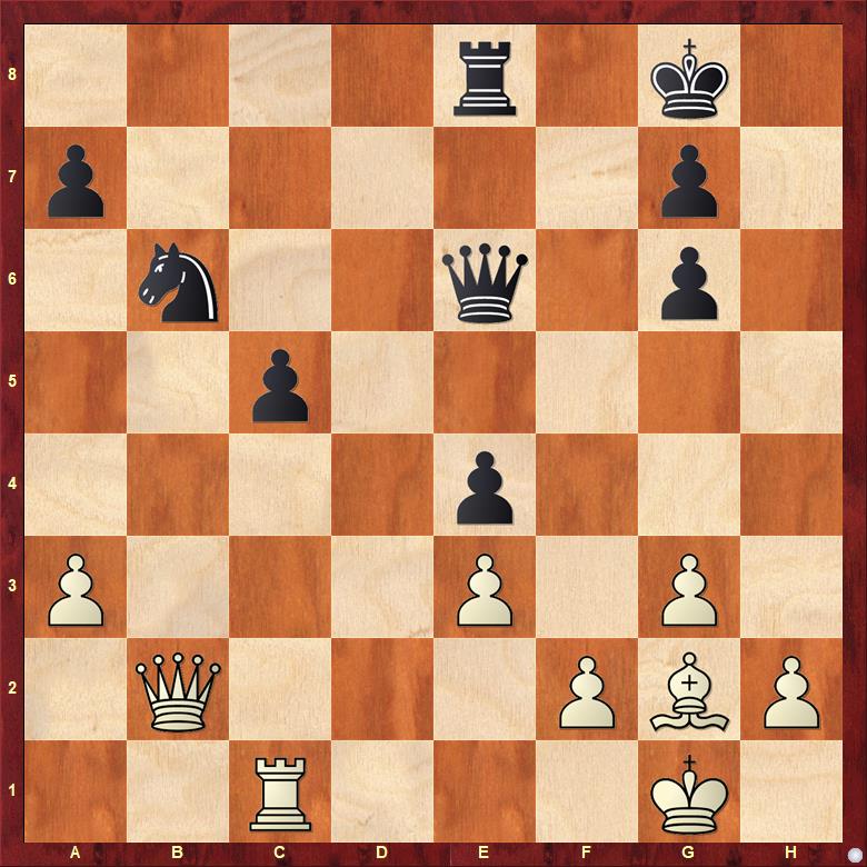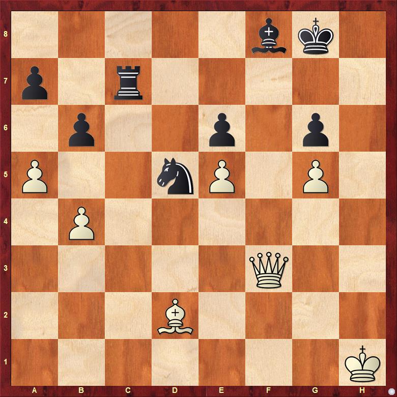 Bílý hrál cílevědomě na výhru, ale tady zahrál 49. Kg2?? a po 49. … Vc2! zřejmě ještě sáhl na dámu (na onlinu se na chvíli objevilo Dd3 a zase zpátky), takže nemohl hrát ani 50. Kh1 -/+ a po 50. Dh3? Jf4+ se vzdal. Dáma ale nemohla ani na d3 nebo e2 pro Jf4+, ani na d1 pro Jd3+, ani na f2 pro Sxb4.