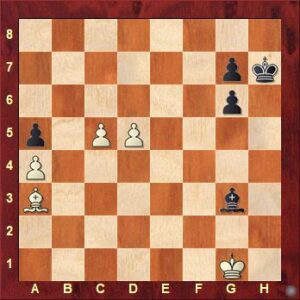 42. g4+! Bílý získává dámu, příp. po 42. … Ke5 může dát přímo 43. De7 mat. Na hodinách měl Vojta 1.27 (hodinu a 27 minut), a to se tam ještě nezobrazila půlhodina přidaná po 40. tahu. Šejdířská ekvlibristika dotažená k dokonalosti. 1:0