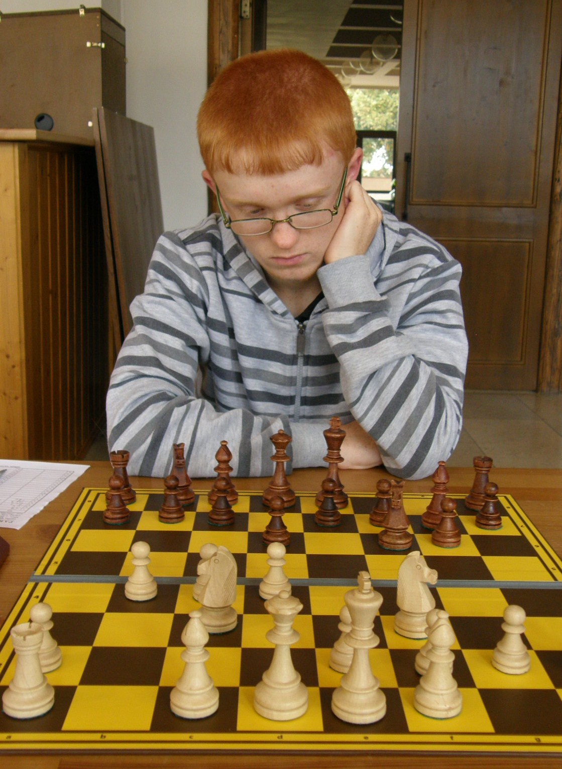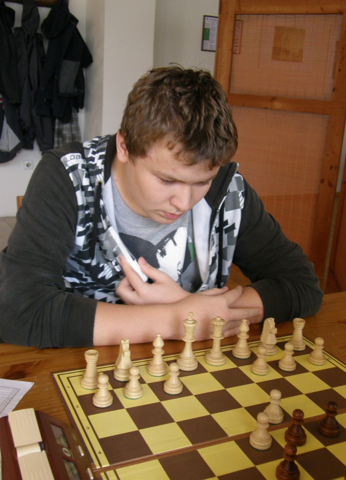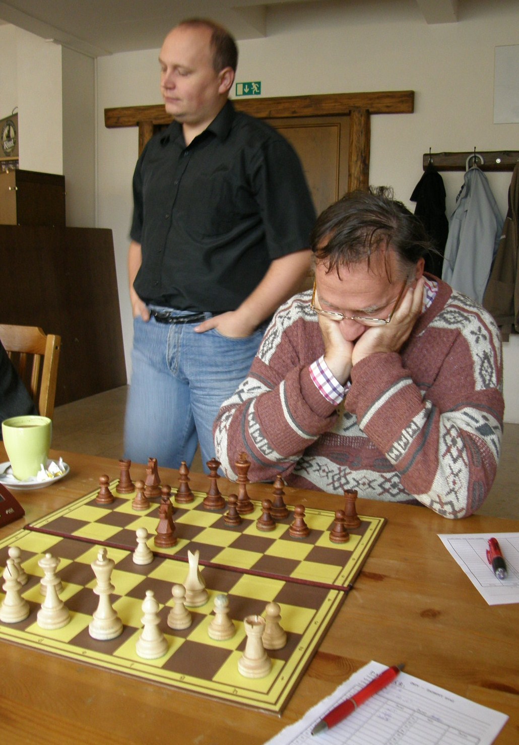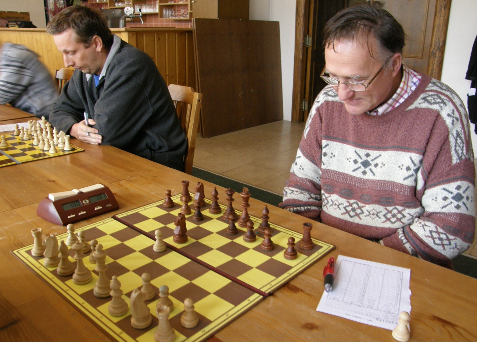 V naší útulné hrací místnosti, (kterou nám i pro letošek poskytl Petr Strákoš, za což mu patří velký dík), se schází překvapivě skoro to nejsilnější, když chybí jen tři výše jmenovaní. Po vyřešení nepodstatných detailů (jakým se hraje tempem?, kdo bude dělat rozhodčího? 🙂 se začíná zostra: na šestce nabízí po zatáhnutí e4 remízu brněnský navrátilec Radek Poslušný brněnskému navrátilci Petru Mareši mladšímu😀 Kapitán oslovenému doporučí „bojuj“, kluci to ještě necelých dvacet tahů zkusí, ale nepříliš výživná partie z rovnováhy nevybočí – 0.5:0,5.
