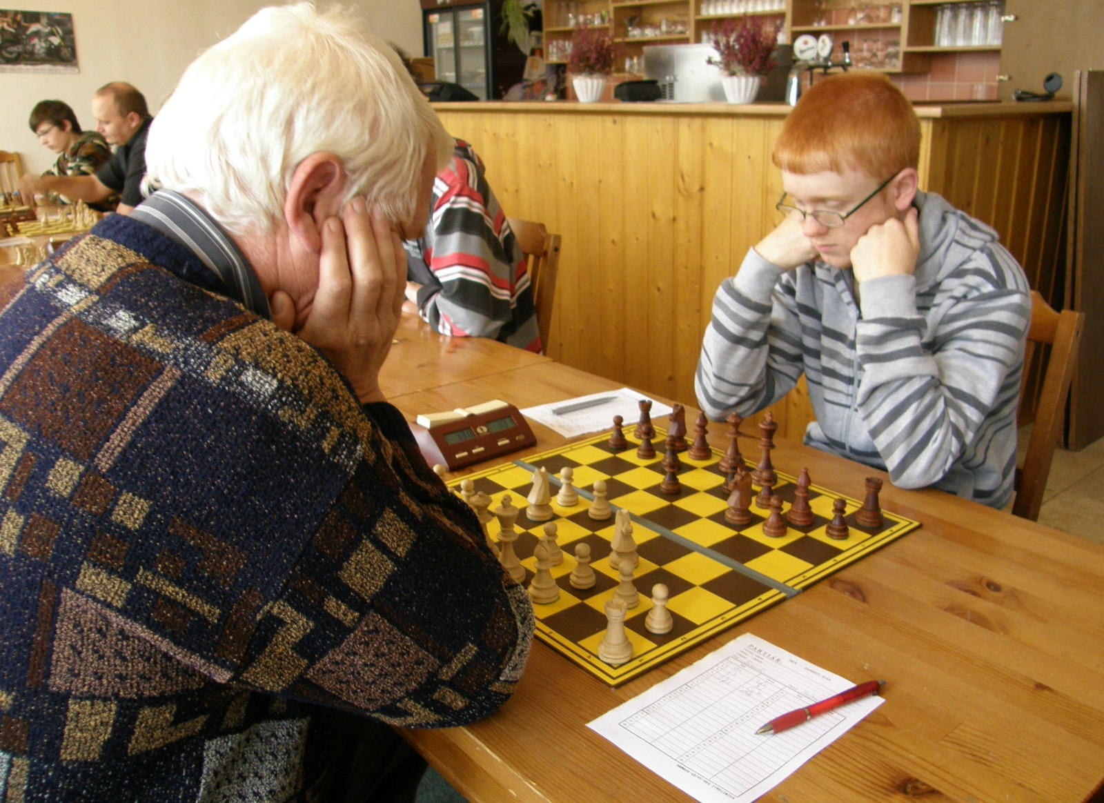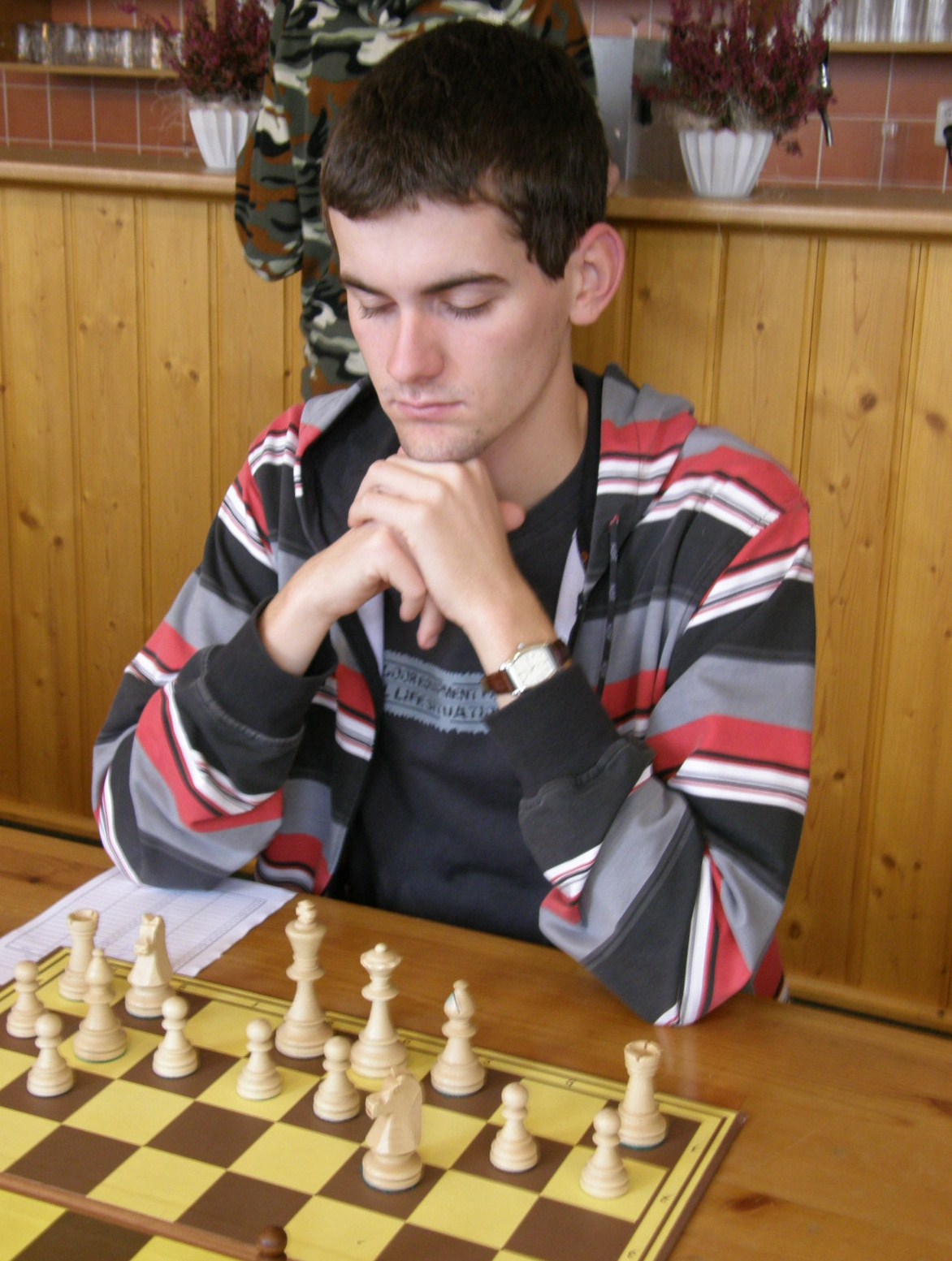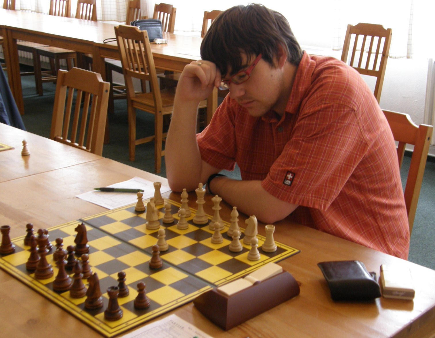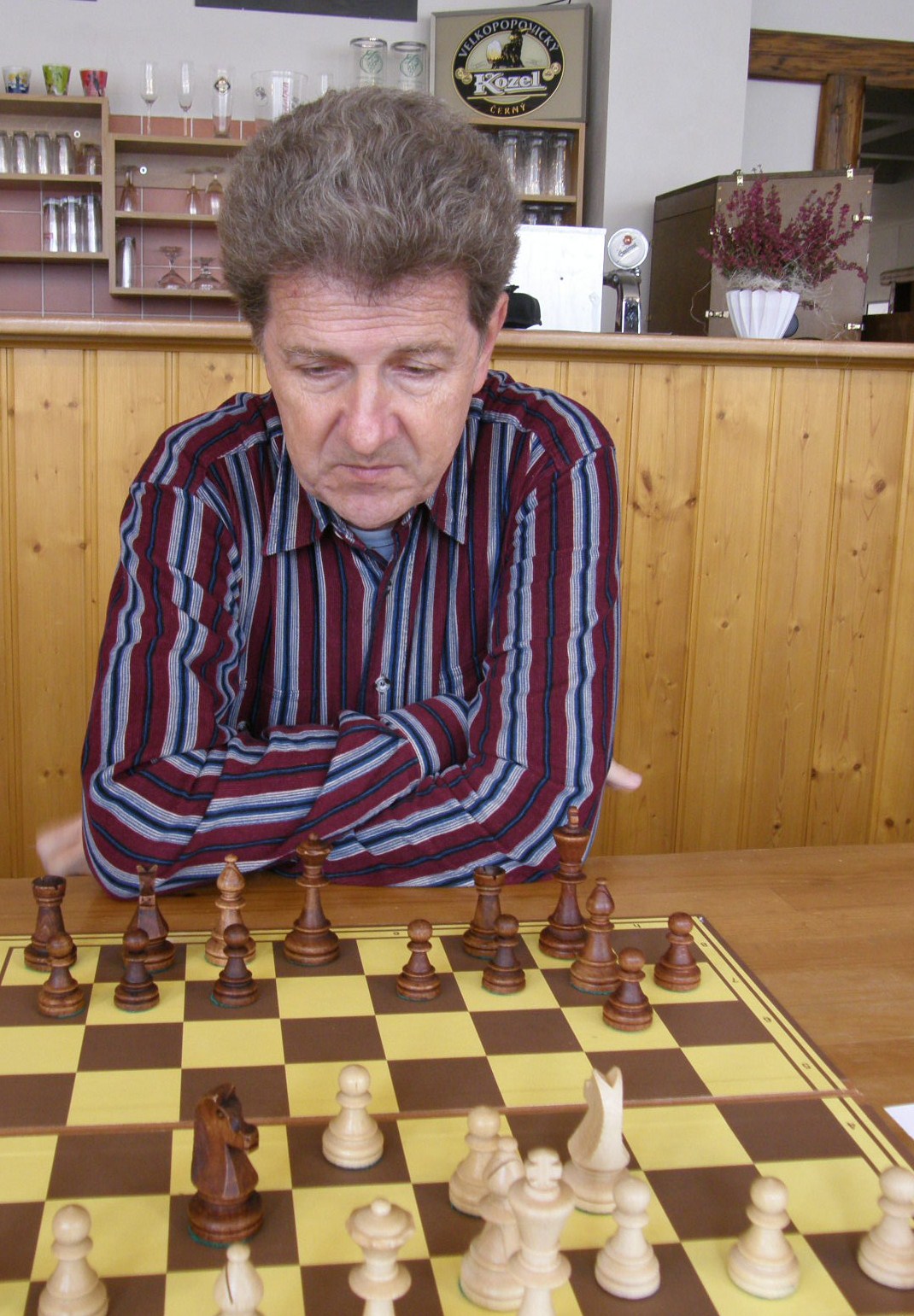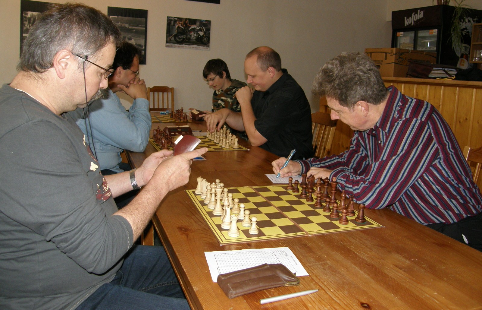 V naší útulné hrací místnosti, (kterou nám i pro letošek poskytl Petr Strákoš, za což mu patří velký dík), se schází překvapivě skoro to nejsilnější, když chybí jen tři výše jmenovaní. Po vyřešení nepodstatných detailů (jakým se hraje tempem?, kdo bude dělat rozhodčího? 🙂 se začíná zostra: na šestce nabízí po zatáhnutí e4 remízu brněnský navrátilec Radek Poslušný brněnskému navrátilci Petru Mareši mladšímu😀 Kapitán oslovenému doporučí „bojuj“, kluci to ještě necelých dvacet tahů zkusí, ale nepříliš výživná partie z rovnováhy nevybočí – 0.5:0,5.