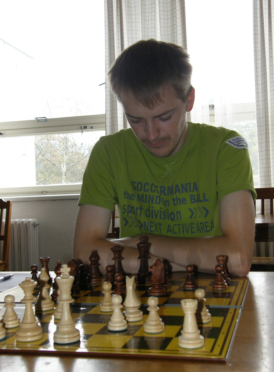 Veškerý odpor houževnatě bojujícího céčka poté lámou duely na prvé a osmé šachovnici, která z nich skončila dříve, netuším. V souboji lídrů se v zajímavé pozici přetlačovali Štěpán Blaško a Jenda Mareš. Sergej tradičně trochu pospal v zahájení, zbavil se bledězelené barvy (sobotní oslava 🙂 ) a získal zajímavou pozici. Na opačné straně šachovnice prováhal Honza zajímavou šanci jak pohnout s centrem v 11. tahu (dc4!?, Sg4!?), posléze obětoval figuru za nějaké ty pěšce a zkomplikování pozice. Kompenzaci počítač vidí, ale naše jednička zachovala klid a v oboustranné časovce černou pozici úplně rozstřílela – 4,5:0,5 a je rozhodnuto.