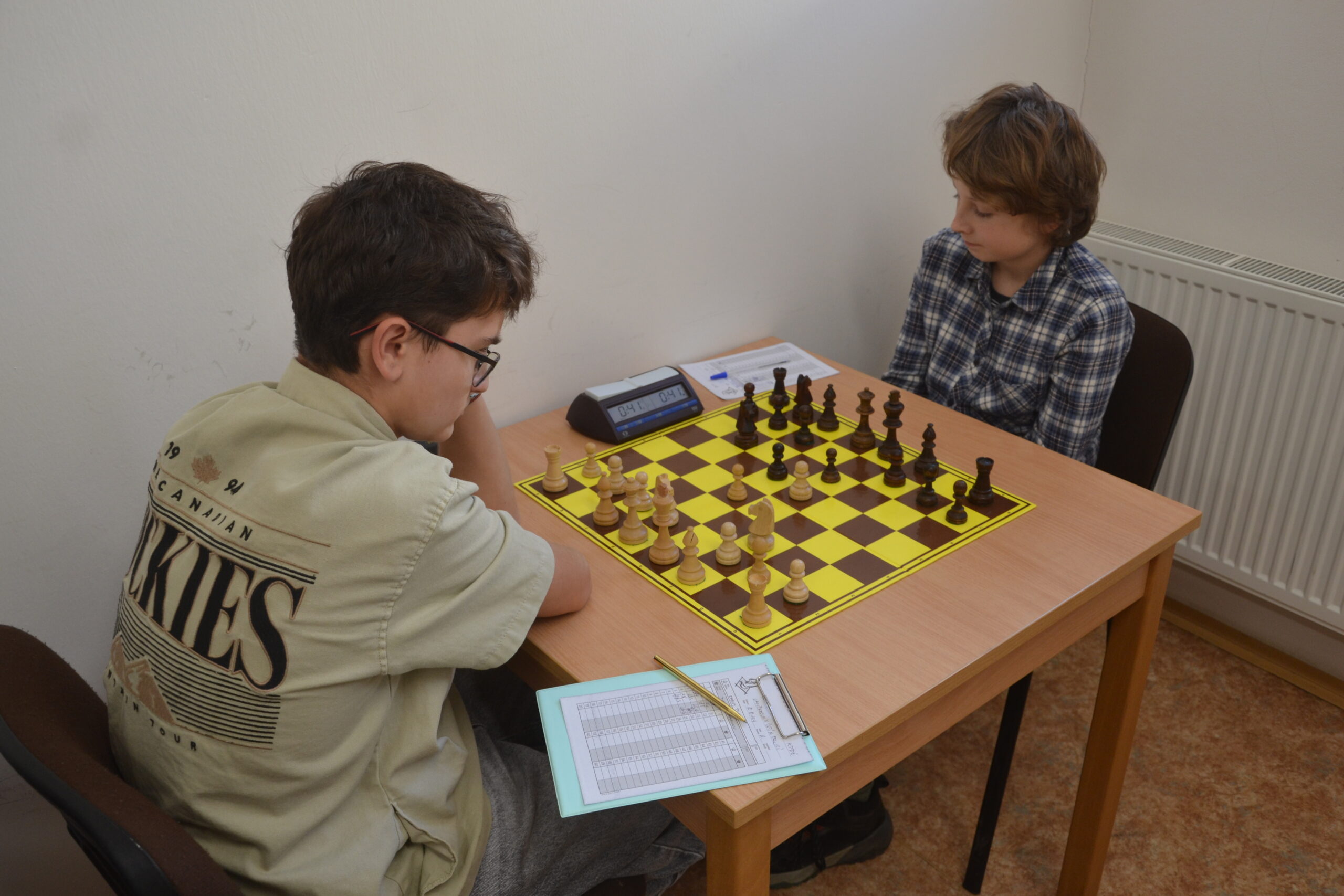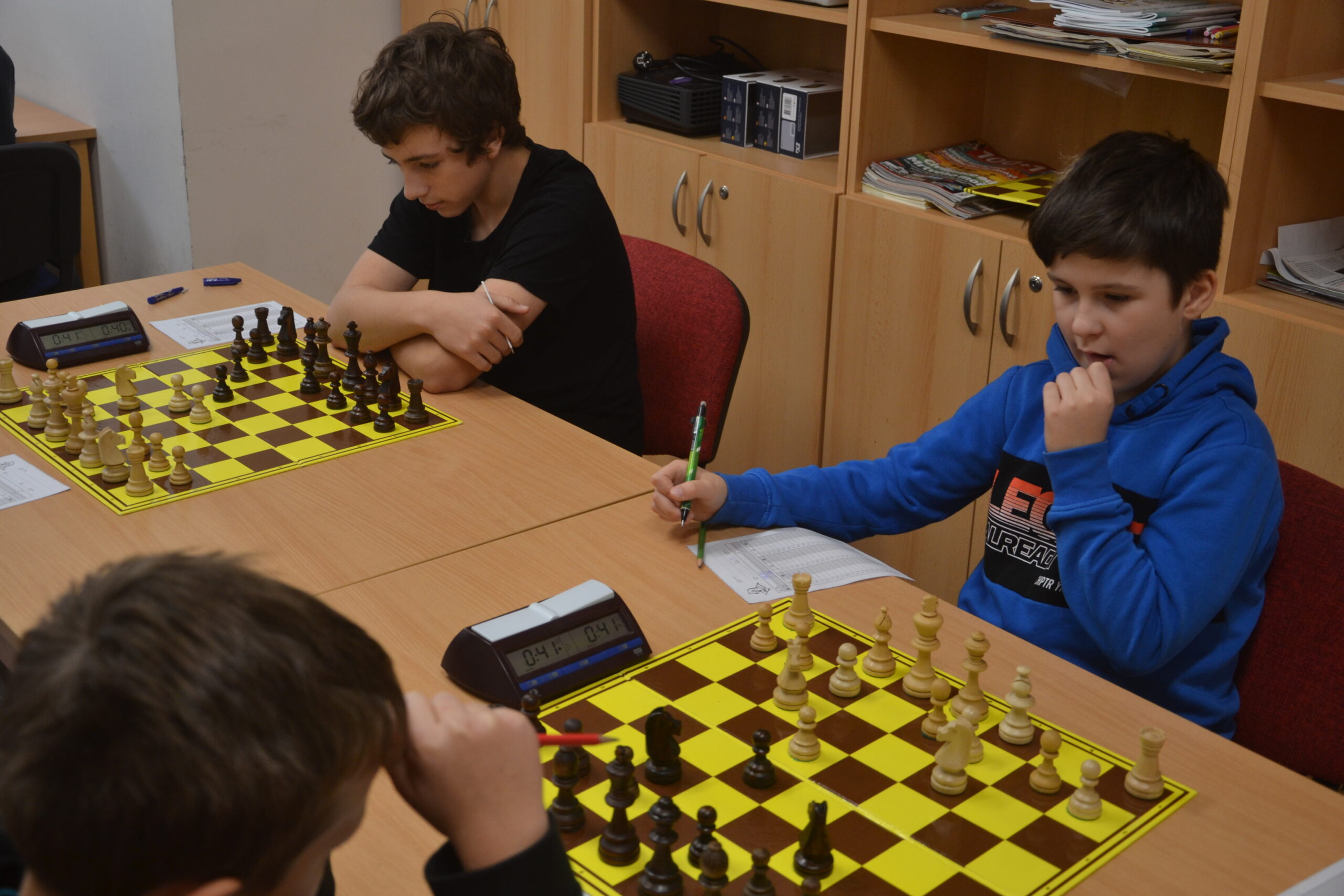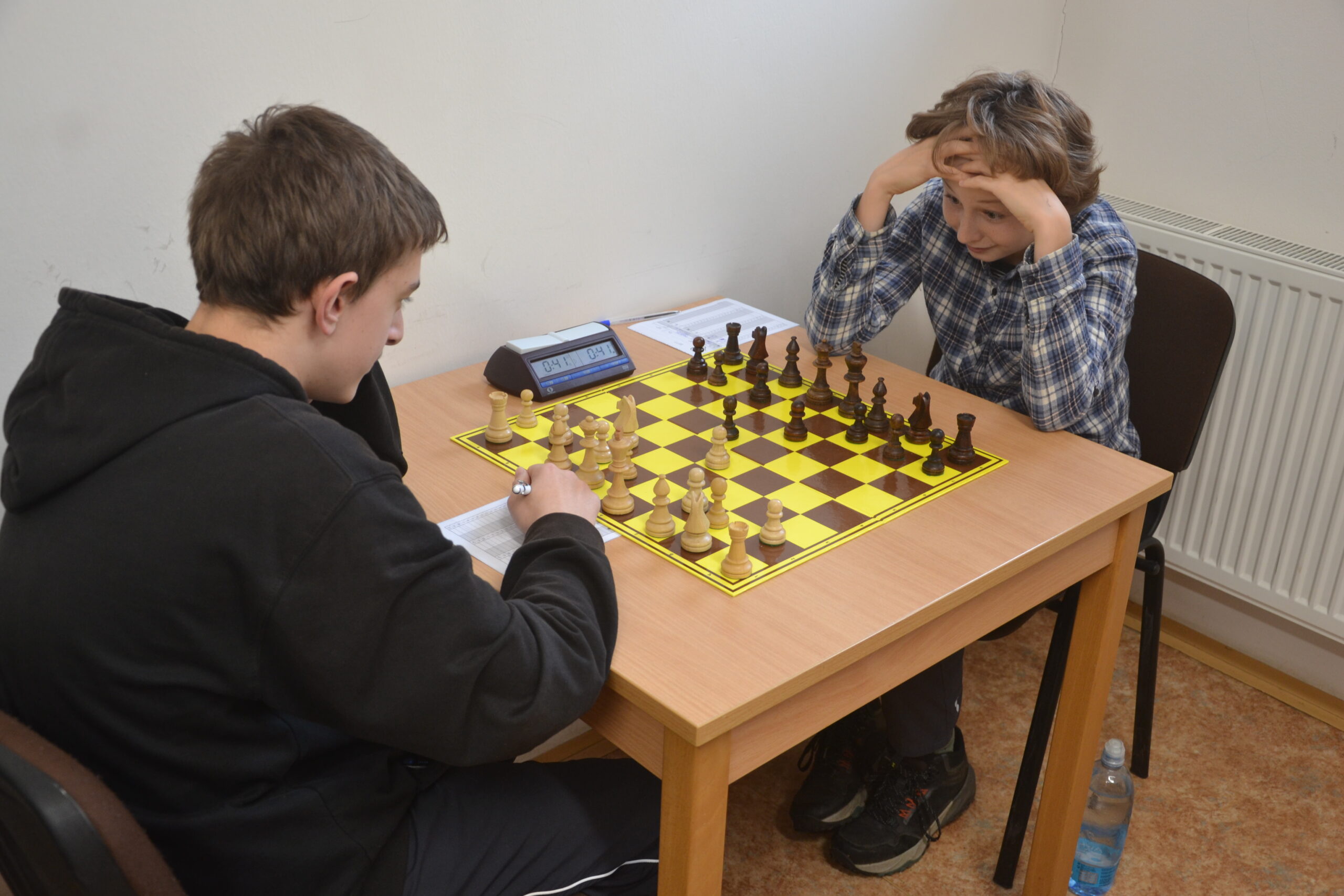 Matěj snad vyhranou partii dotáhne, takže bude záležet na Skubíkovi, který má už dvě figury míň, ale mlží proti králi v centru.