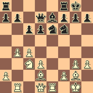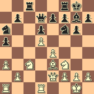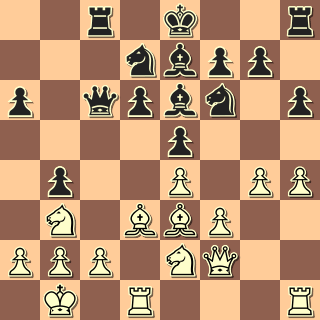 Martin to postavil podle mého vkusu a nemá černými žádné problémy. 15. e5?! Takovéhle hurátahy ve mně moc důvěry nevzbuzují; bílý přece nemá výhodu, aby mohly být násilné prostředky co k čemu. 15. … Jg4 16. Sd4 Jc5 17. h3 Jxe5 18. Jxe5 dxe5 19. Sxe5 Sxe5 20. Dxe5
