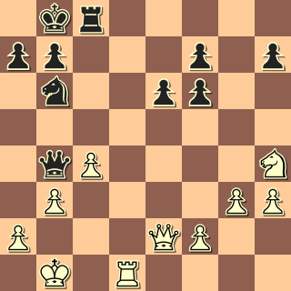 Bílému se povedlo vyměnit černopoláky, ale jinak se nikam nedostal, po nějakém Vfd8 a Dd6 směřuje partie do remízy. Jediným problémem pro Martina byla blížící se kisna. 20. … Dc7? Chyba, která zůstala nevyužita. 21. De2? Do učebnic mohl bílý vstoupit po 21. Dxc7! Vxc7 22. d6!! exd6 23. Jd5 +-.