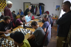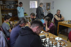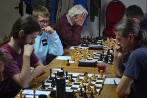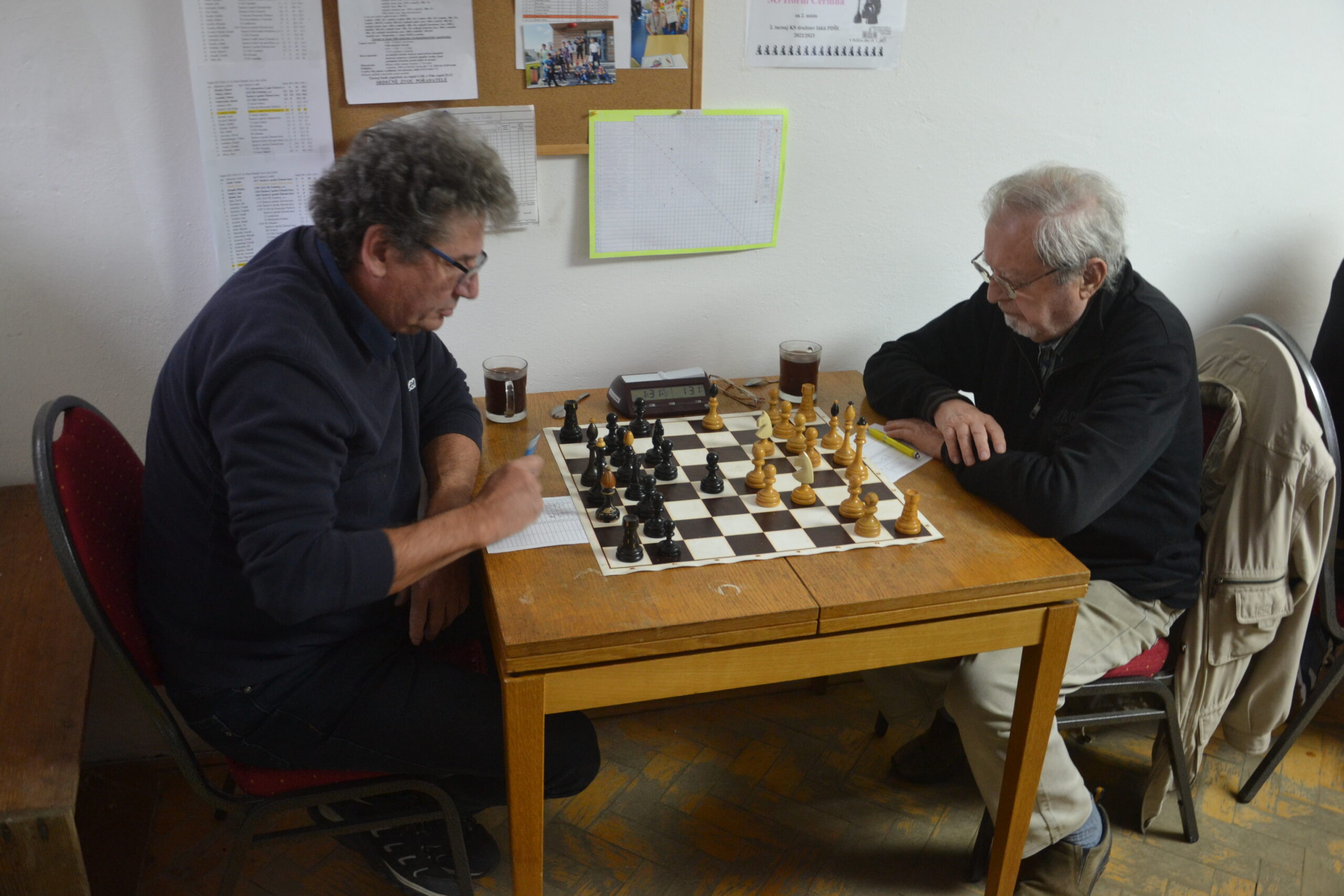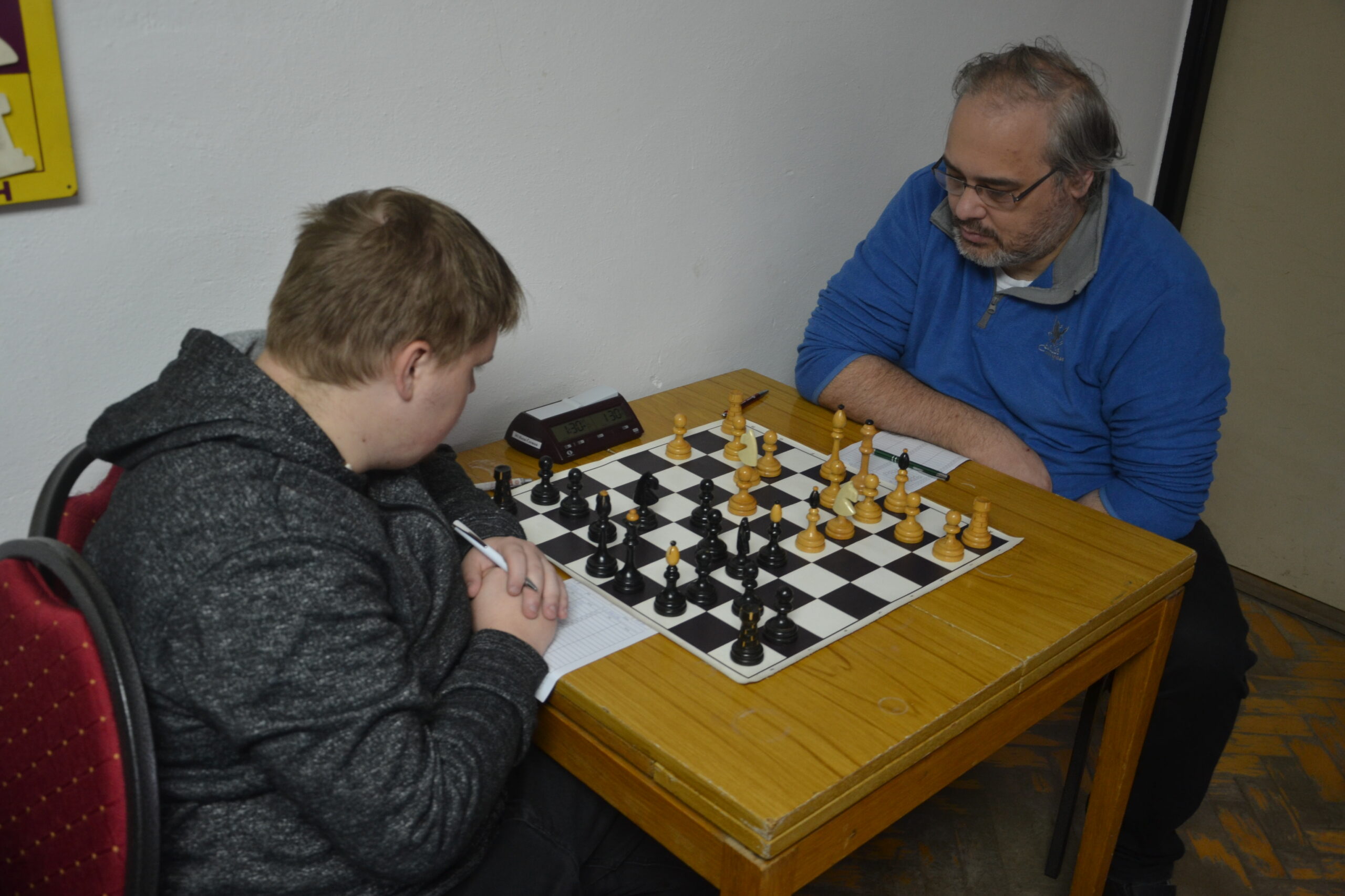 Pusztai hraje dobře, vždyť včera remízoval s naší žákovskou jedničkou Marianem Pokorným! 😉 Kuba si v klidu hrál svůj londýnský systém, černý kombinoval tah d5 a g6 jako v Grünfeldovi. Ve snaze o protihru se černý oslabil tahem b5, Kuba kontroval a4 a pěšce tam nakonec získal. Říkal jsem si, že pomalu dokráčí k výhře, ale pak jsem neměl čas partii sledovat, černý našel protihru, získal pěšce zpátky a Kubovo rozhodnutí vzít půlku bylo asi správné. (Kdo máte partiáře, můžete mě korigovat. Tady se na nějaké bulletiny nehraje.) 1/2