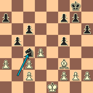 Bílý má výhodu. Král má blíž do boje, černý jezdec může mít na kraji potíže. Na druhou stranu kůň může být i potvora a černé áčko bude vzdálenější volňák než bílé déčko. 26. Sxc6 Jxa3 27. Kd2 a5?! Po 27. … Jc4+ by jezdec mohl přejít na d6, tedy do centra. 28. d5?! Pěšec zatím nehrozí projít do dámy. Po 28. Sd5! by černý jezdec neunikl. 28. … b4? Nesmyslně mění volného a pěšce za jednoho z c pěšců. 29. cxb4 axb4 30. Kd3 g5 31. d6 Kf8