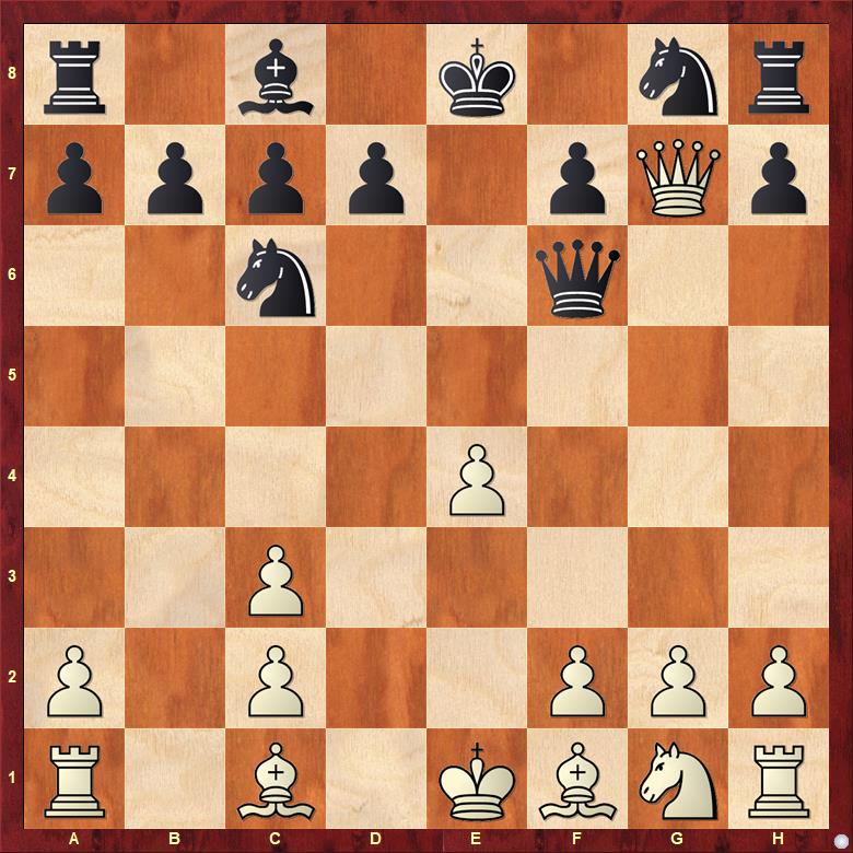 7. Sh6!! +- Hrozí mat na f8, po Dxg7 je Sxg7 se ziskem věže, po Jxh6 nebo Jge7 visí černá dáma. Ještě nejlepší je 7. … Dxh6 8. Dxh8, ale i tam má bílý velkou výhodu.