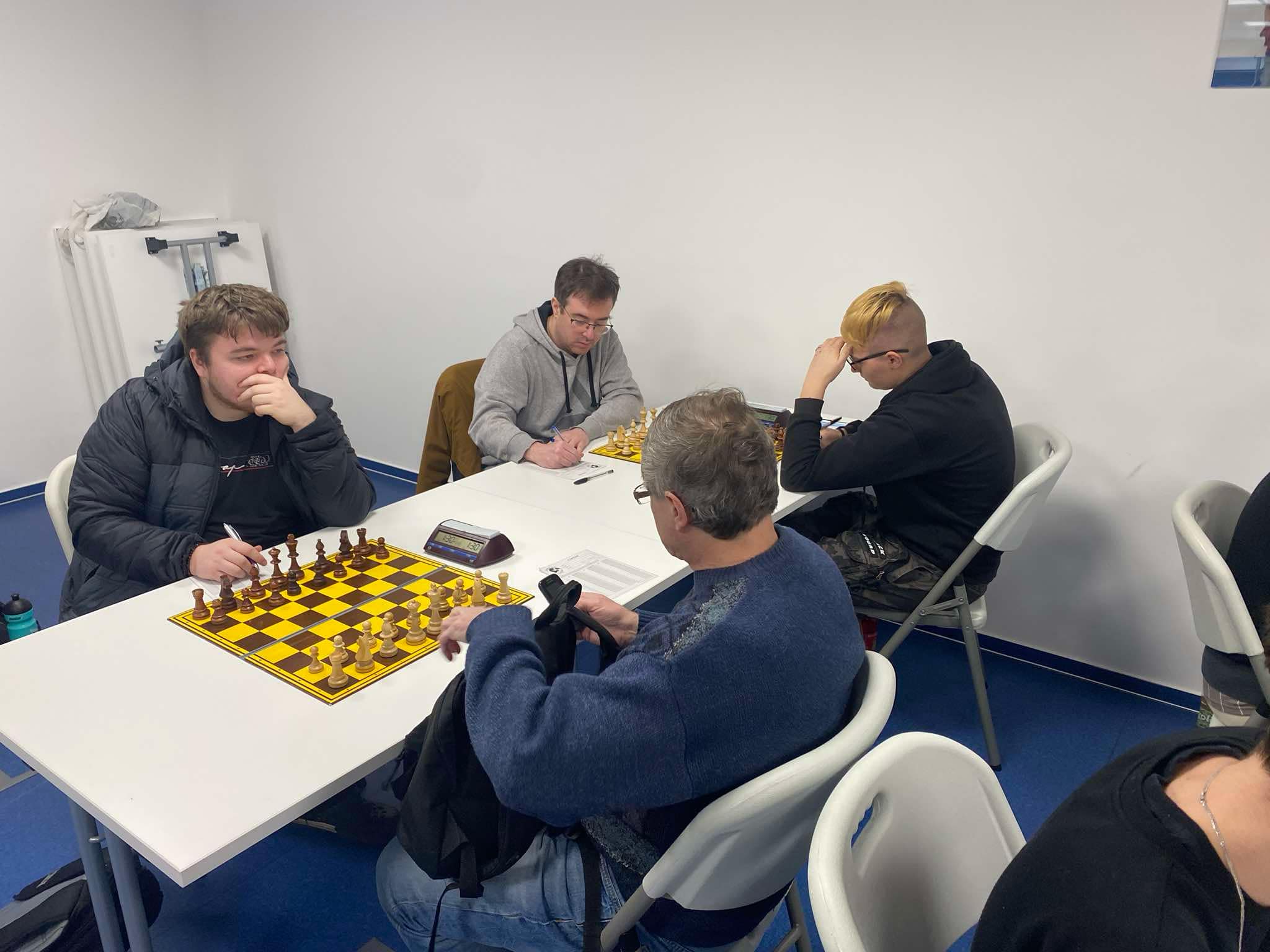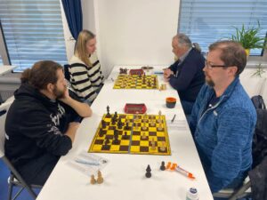 Nejdelší partie dne, která končila až v 15:30. Zdenda měl pěšce navíc ve věžové koncovce. Každý známe poučku, že všechny věžovky jsou remis. I tady se to potvrdilo, což nakonec znamenalo naši prohru. Ale Zdenda tlačil a máme za to, že to mohl i vyhrát. Pozice byla: Kf5, Vd6, a3, b4, f2, f4, h3 a černý: Kf7, Ve7, a6, b7, c6, h7. Počítač hlásí výhodu, ale hrajte si to přesně na minutě.