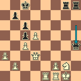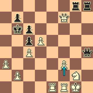 A bílý se – až teď – hluboce zamyslel. Věřte nebo ne, má právě jednu jedinou cestičku, jak partii aspoň remízovat. 3. Ve8+!! Kc7 (3. … Vxe8?? 4. Jxh4) 4. d6+ Kb6 5. Db3+ Ka7! (5. … Ka6?? 6. Va8+!) 6. Da4+ nebo 4. … Kd7 5. Df5+!! Kxe8 6. Dc8+ Kf7 7. Df5+. Komu by se však chtělo s figurou a dvěma pěšci navíc hledat pouhou remízu? 3. Df5+? Kc7 4. Df7+? (aspoň 4. De5+ a 5. Dxh8)  Kb6 5. f3