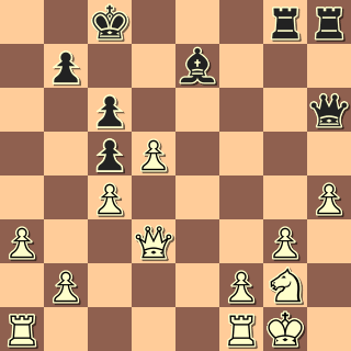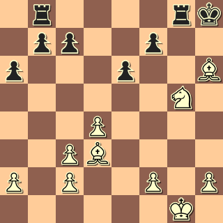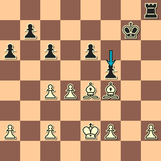 Škoda, že jsem neviděl, jak tohle postavení vzniklo. Tři lehké figury proti dvěma věžím se opravdu nevidí moc často! 1. Kf1! Odchází z vazby, hrozilo f6. Nyní má naopak silnou hrozbu bílý: hrozí 2. Jxf7 mat! Černý má jedinou rozumnou obranu: 1. … f5. Pak by se mohl rozhořet opravdu zajímavý boj, např. po 2. Jf7+ (ne ale 2. Jxe6?? Vg6) Kh7 3. Sf4 Kg7 4. Je5. Bílý má jasnou výhodu. Má plán – postup h pěšce – a černé věže nemají sloupce. Jakýkoliv kontakt černých a bílých figur hrozí ztrátou kvality. Jde dokonce i 3. d5!? Kg6 (3. … exd5?? 4. Sxf5+) 4. dxe6 se ziskem pěšce. 1. … Vxg5? Nevydržel s nervy, ono sledovat to rejdění lehkých figur kolem krále je nepříjemný. Ale dva střelci budou jasně silnější než věž a h pěšec je zlatý poklad. 2. Sxg5 Kg7 3. Ke2 Vh8 4. Sf4 f6 5. Se4 c6 6. c4 f5??