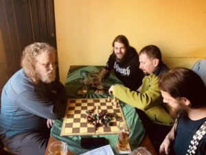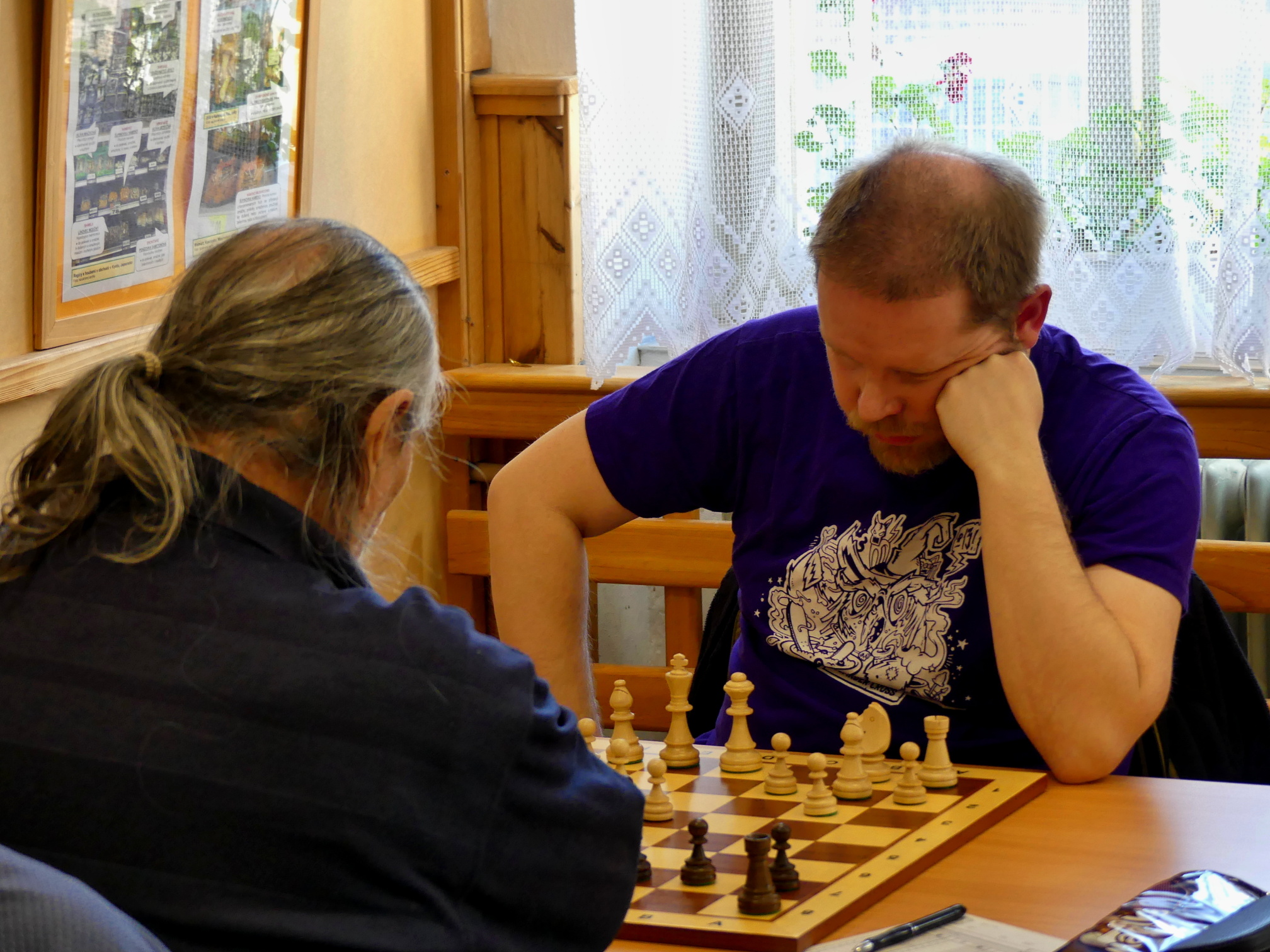 Plán urvat něco vepředu a zbytek držet dostal kolosální díry asi za čtvrt hodiny, kdy Hurťák přistál bílými v !8. tahu! v prohrané pozici. Já vedle pracně a nesmyslně vymýšlel zahájení s rovnou pozicí, Patrik zavřená francouzská asi taky bez výhody. Naštěstí se mi brzy líbil Martin na čtvrté a přímočaře útočil i o stůl a řadu dál Marian. Šestka jakž takž, sedmička směřuje k festivalu obětí, osmička solidní karokánek.