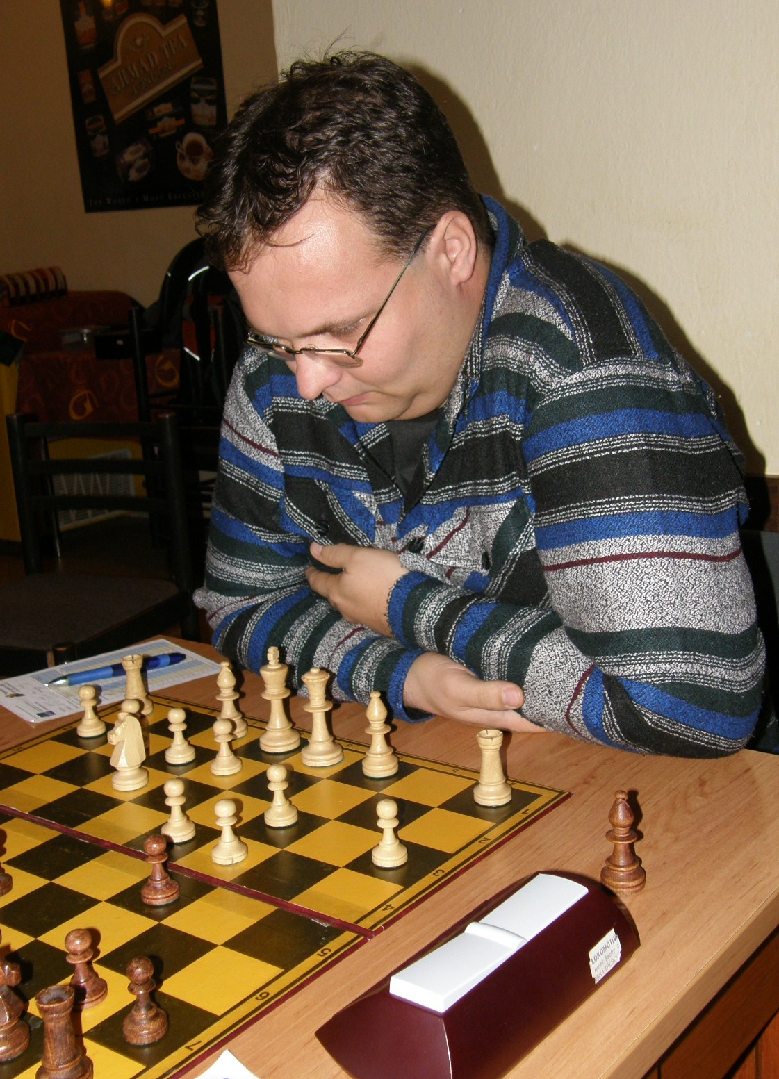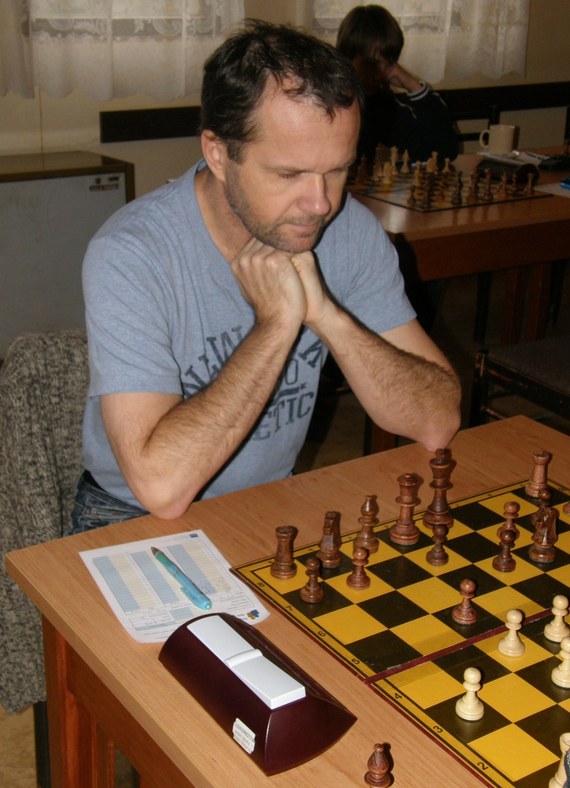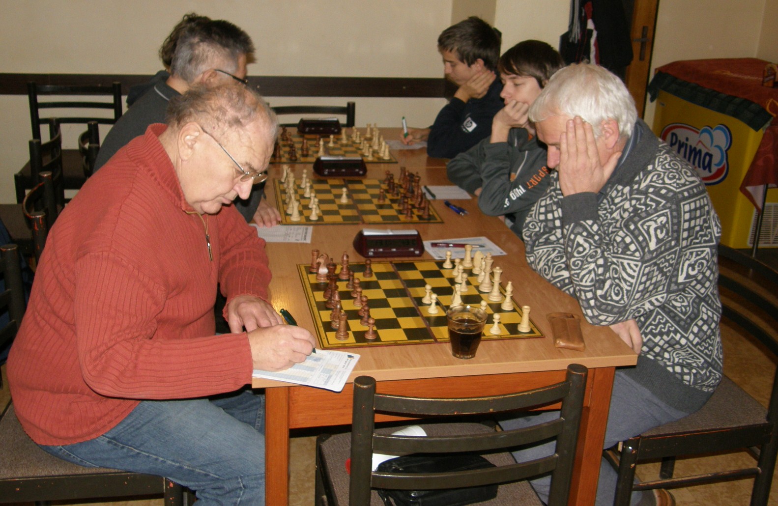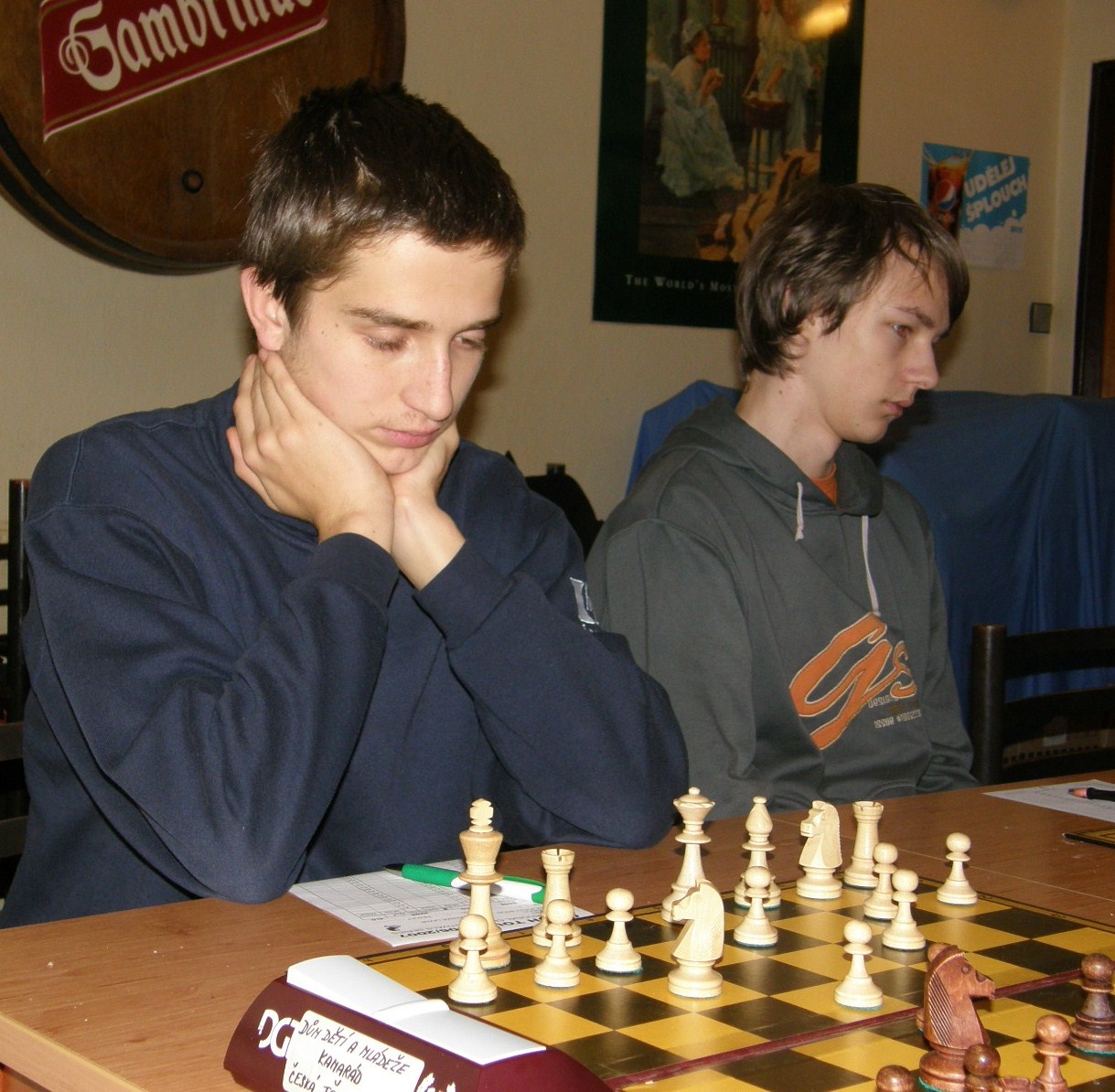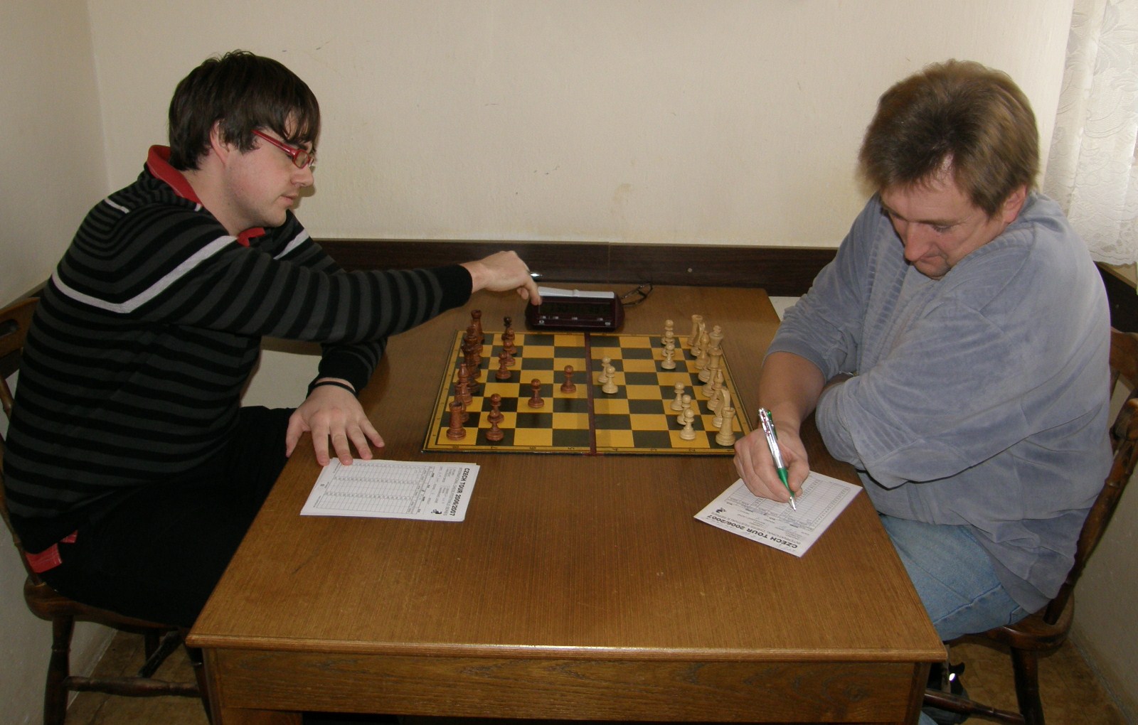 A pak už se bojovalo docela srdnatě. Dobře to s námi vypadalo na jedničce a sedmičce, bídně na osmé, ostatní něco mezi nulou a bodem 🙂 Stejně jako proti Čermné jsem třetí dohrál já, opět černými, opět benoni proti Cole systému, jen soupeři změnili. Karel Jasanský vyměnil bleskurychle dámy a postavil nefalšovaný prešovský beton. Má snaha prokousat se do pozice taktikou a vývinem selhala a nakonec jsem byl rád, že jsem si nevykoledoval nějakou blbou čtyřvěžovku se zdvojeným béčkem. Remíza byla kolem 25. tahu podepsána mlčky trojím zopakováním pozice. A já už doufám, že konečně dostanu někdy bílý a možnost trochu aktivně hrát… černými se do remízových systémů s d4 a c3 tluče blbě 🙁 2:1 pro Ústí.