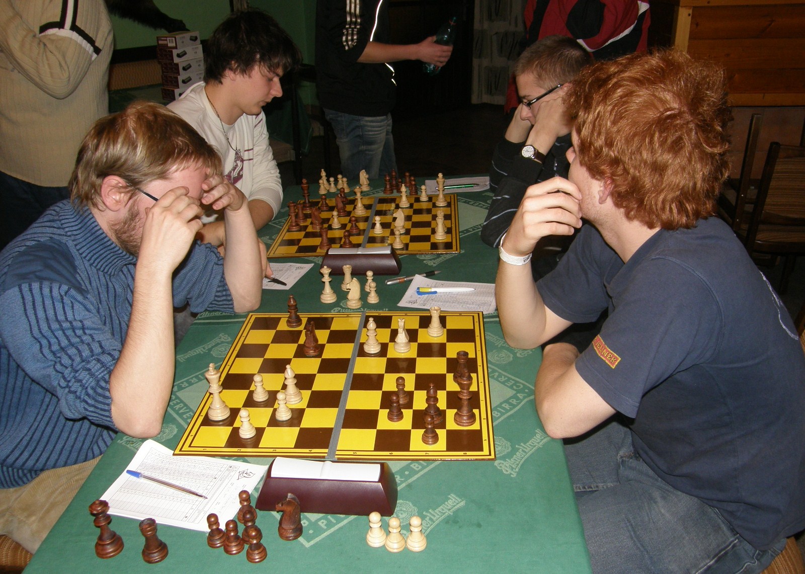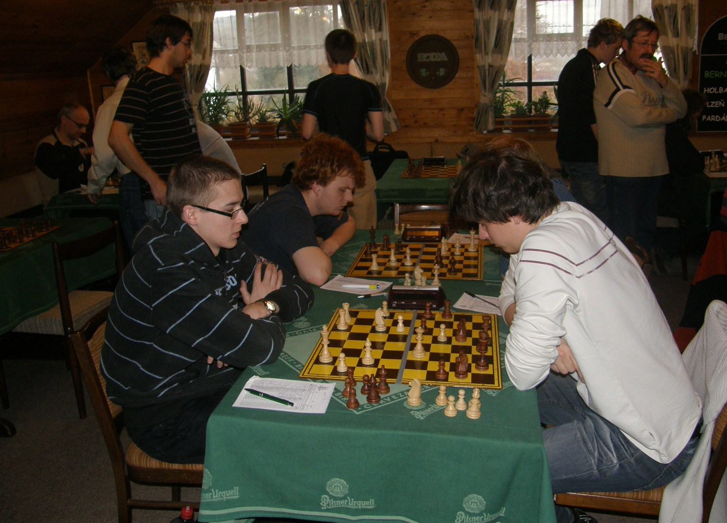 První obchůzky šachovnic signalizovaly celkem vyrovnaný boj s tím, že někde to snad půjde. Pak vyhrál po soupeřově hrubce Petr Mareš. 1:0 Druhý bod připojil Honza Šimek, u kterého se to dalo z průběhu partie čekat a brzy po něm vyhrál Martin Šmajzr. 3:0 Beznadějnou koncovku vzdal už po kontrole Martin Petráž. 3:1 Jistotu bodu dodal týmu Michal Zeinert. 4:1 Dohrávaly se tři koncovky a vzhledem k tomu, že Lukáš Hurt měl figuru, bylo to bez rizika. Taky pak vyhrál a když jsem šťastně doplnil bod i já (Pavel Holásek), bylo to nádherných 6:1. Poslední koncovku tahal Martin Pečinka, s dvěma pěšci za chybějící kvalitu a s remízovým vyústěním. 6,5:1,5