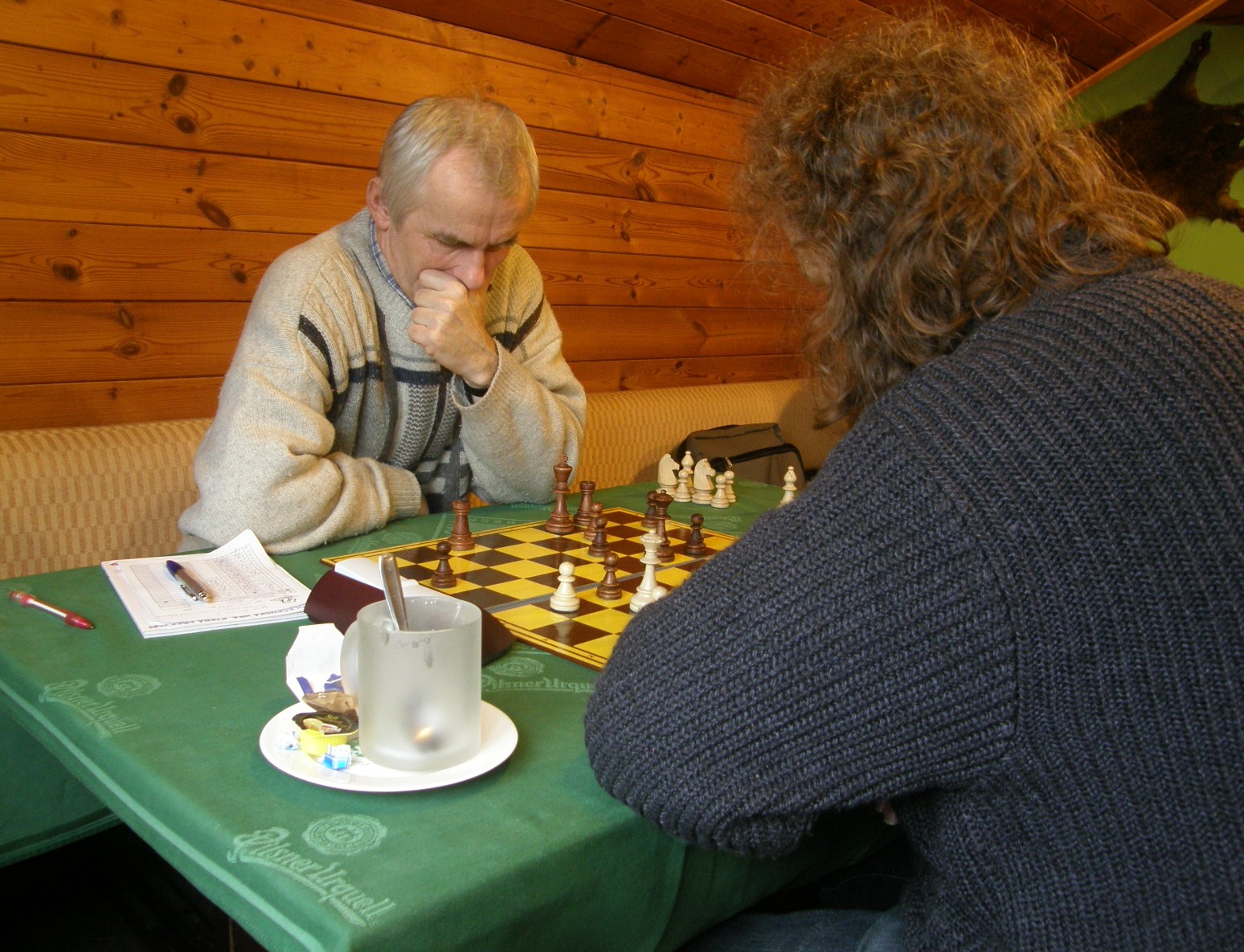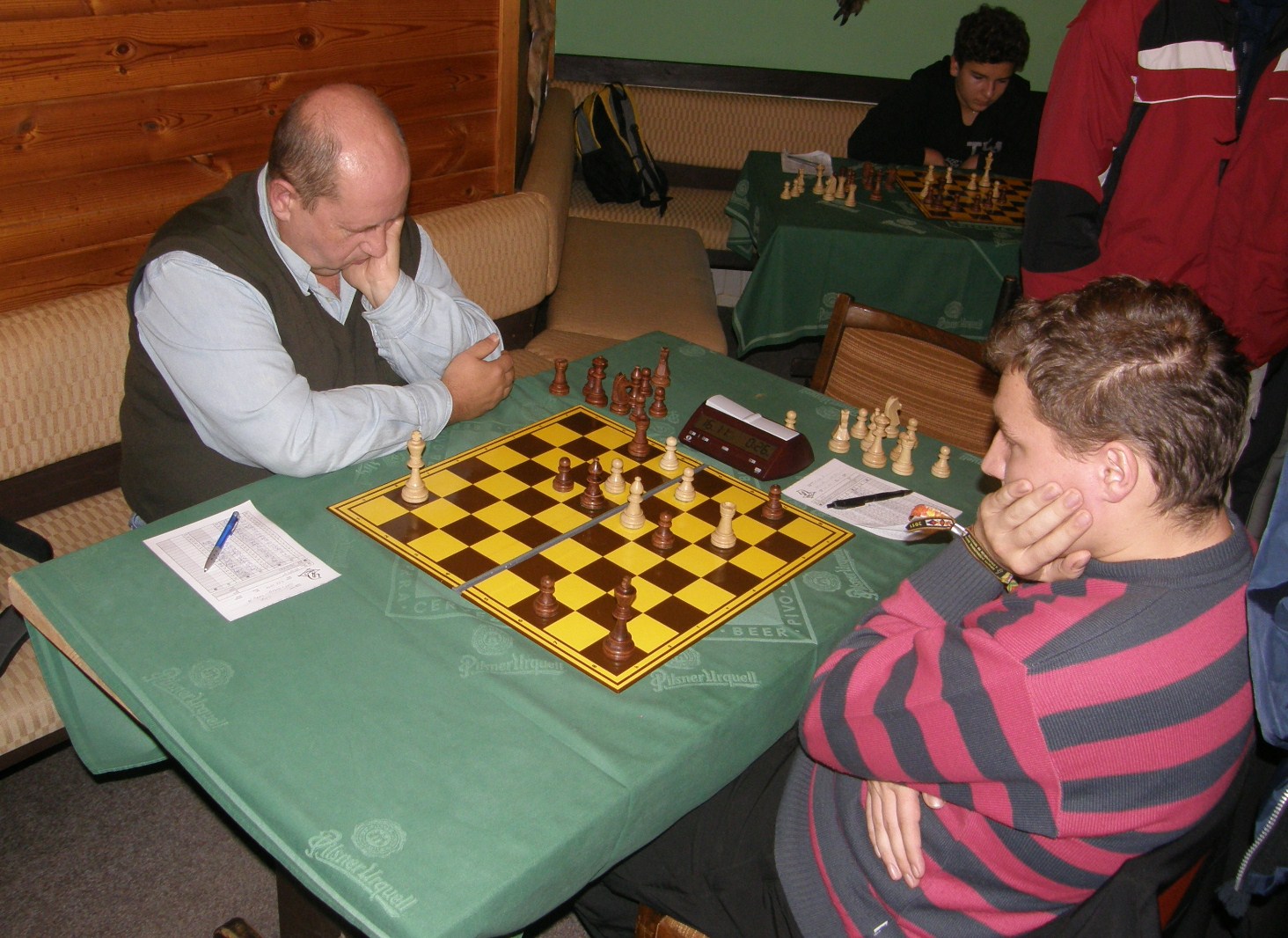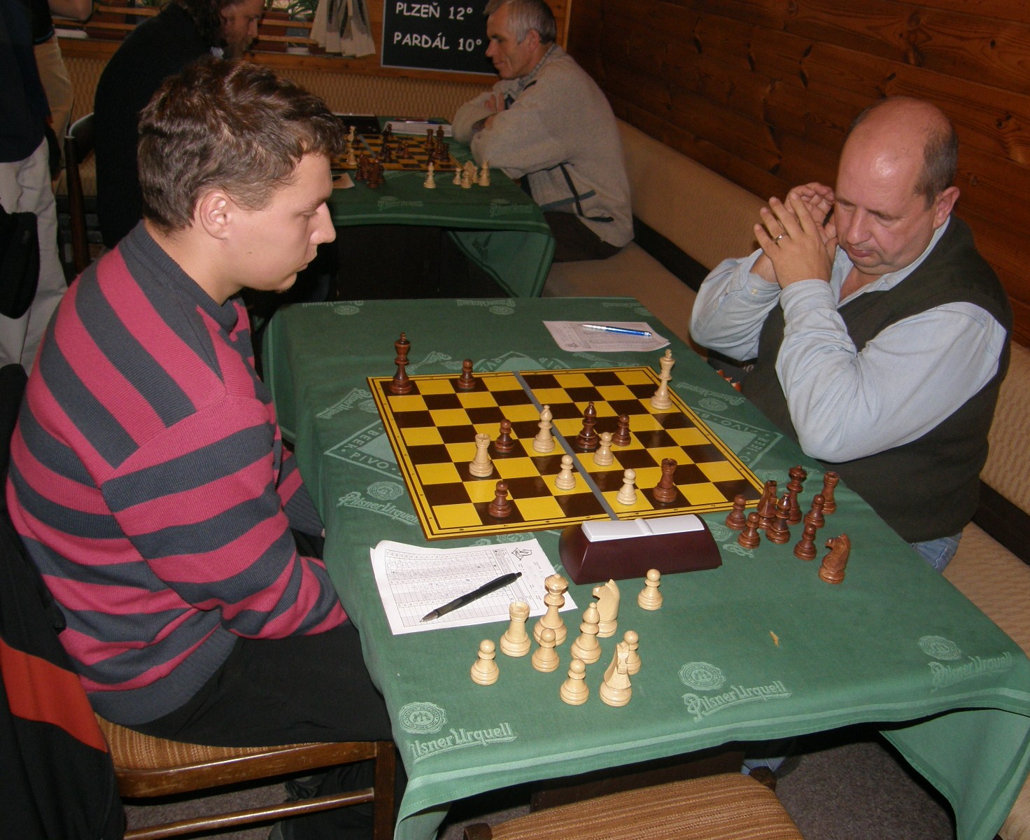 Můj starý známý soupeř původem z Poličky sehrál zahájení otřesně (v sicilce Jf6-g8) a těšil jsem se, že vyhraju v miniaturce – náskok ve vývinu, soupeřův král v centru apod. Někdy kolem dvacátého tahu jsem ale ztratil nit a ani času už nebylo nazbyt, ze setrvačnosti jsem ještě odmítl půlku, ale výhoda byla pryč. Po kontrole jsem (za stavu 4:1) remízu smířeně nabídl, ale soupeř se mě rozhodl potrestat, obětoval pěšce … a ve věžovce prohrál. 1:0