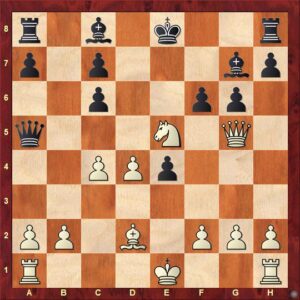 Bílý má vidli na dámu a jezdce, takže černému stačilo rozumně ustoupit vlastní napadenou dámou, např. na b6 (šlo i Dxe5!?). Zahrál však 13. … Dxd2?? a bílému se otevřela cesta minimálně ke stříbru. Jenže, ačkoliv jindy hraje až příliš pomalu, tady okamžitě vzal do ruky krále … a uvědomil si, co provedl. 14. Kxd2?? fxg5 samozřejmě prohrává, kdežto 14. Dxd2 partii otáčelo. Taková škoda!