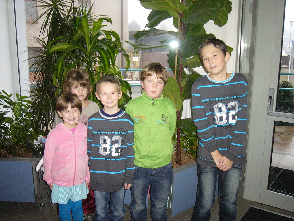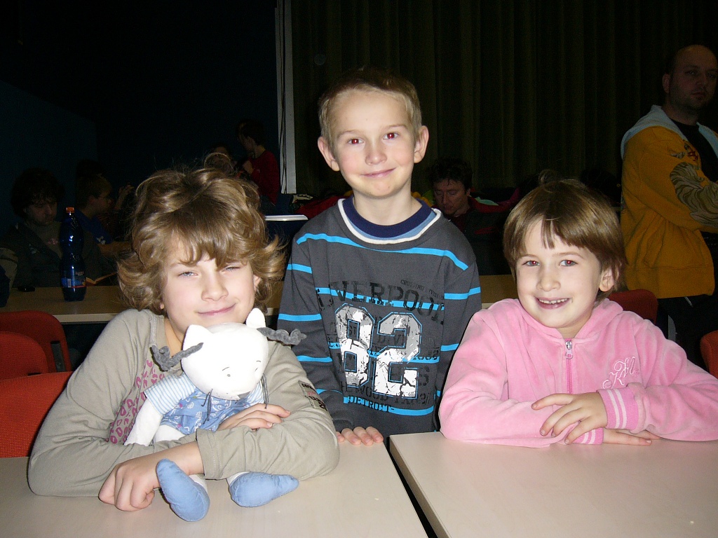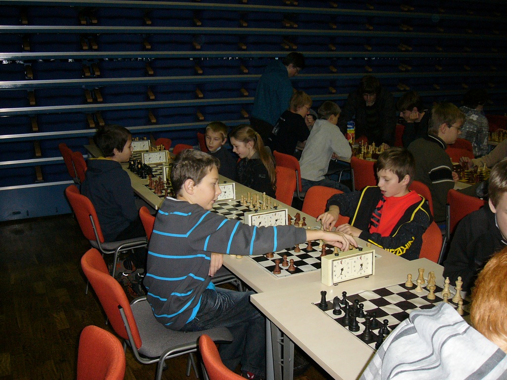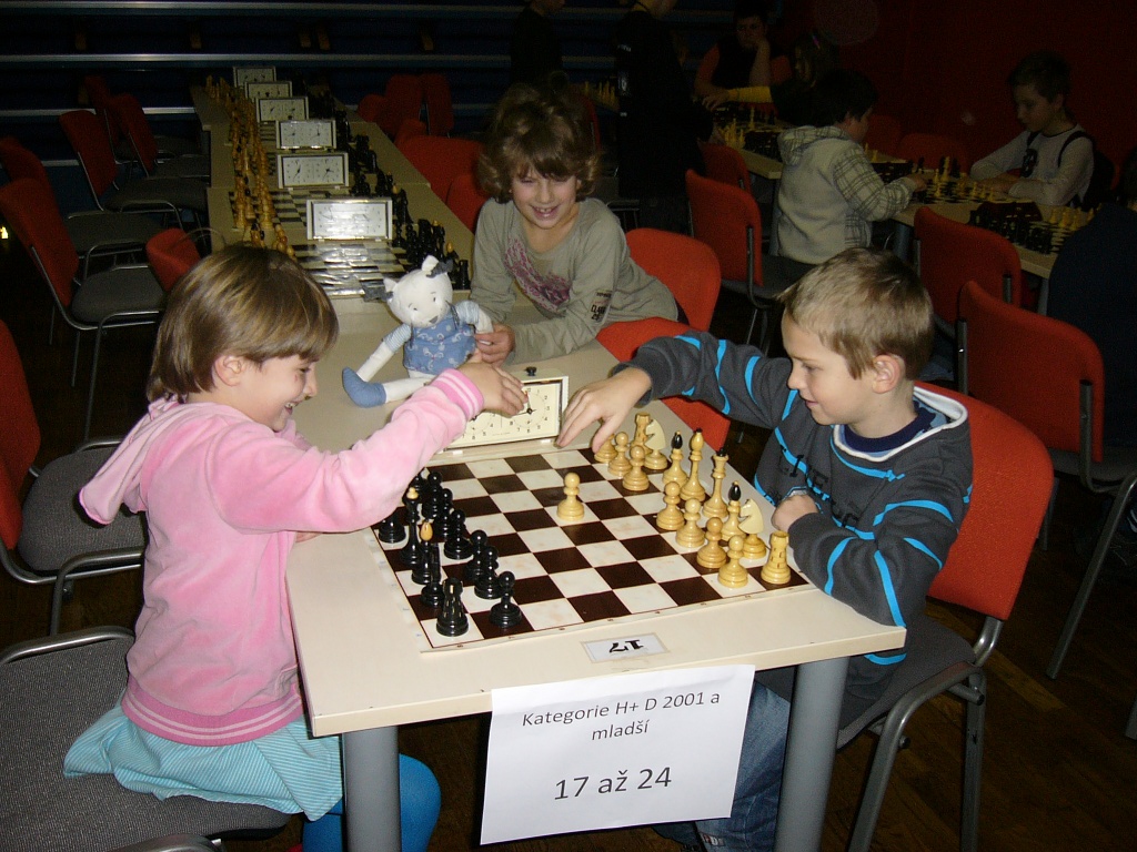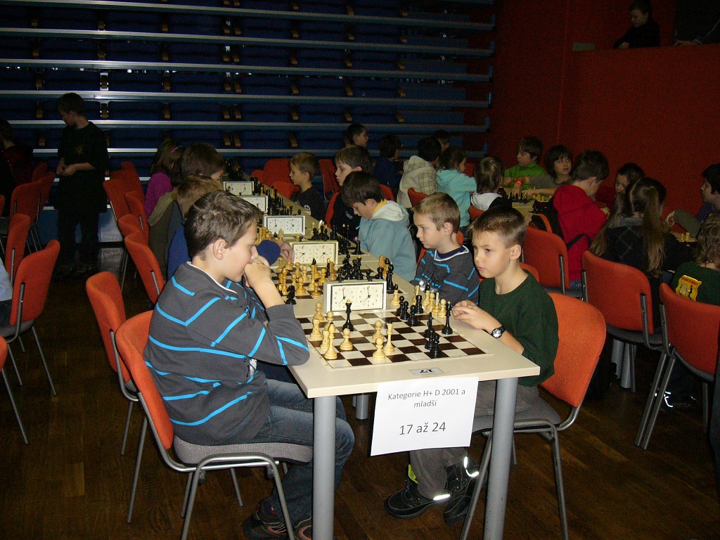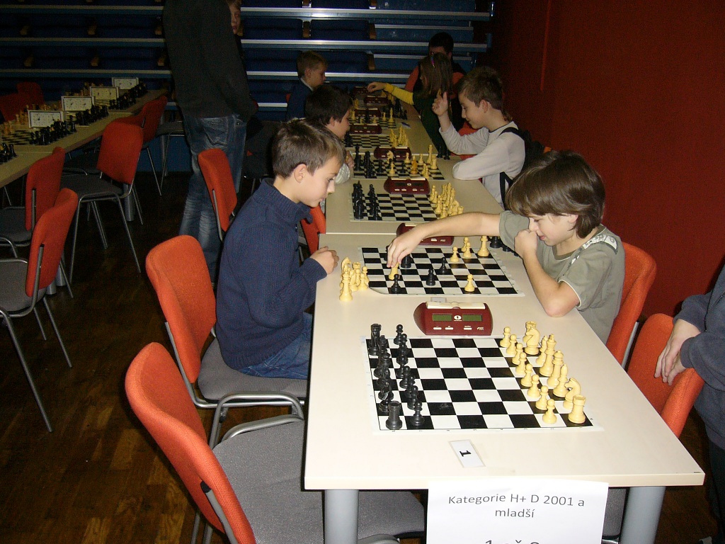 Hned osm (!) našich nadějí v kategorii slibuje, že náš oddíl v budoucnu jen tak z mapy nezmizí. Vojta Holásek dle očekávání bojoval vepředu. Po startu 4/4 narazil na Brejšu, kterého sice mohl věžema na sedmičce zmatit, ale dopustil proměnu a pěšce v dámu, načež se situace obrátila, škoda. Pak porazil Pavlíčka, ale prohrál s Ludvíkem, naštěstí byl z pětibodových nejlepší. 5/7, 5. místo. Druhý z našich opět očekávaně Jirka Píše, ve druhém kole s Brejšou dokázal remizovat, v dalším průběhu sice prohrál s Pavlíčkem a Simonem, ale závěrem 2/2 ztracený terén celkem dohnal. 4,5/7, 11. místo. Následují těsně za sebou obě holky z kategorie desítek, Veronika Holásková jen o místo před Kačkou Dudlovou, ta se může pochlubit skalpem Honzy Nešpůrka (1307!). Obě 4/7, 16. a 17. místo. Už pod 50% se ocitl Martin Paukert, delší neúčast v turnajích je určitě znát, ale hlavně, že s námi vůbec vyjel. 3/7, 26. místo. Stejně bodů, i když se slabšími soupeři, získal Michal Píše, po startu 0/3 hrál hodně vzadu, ale třemi výhrami se dostal na rozumná místa. Oba bratři Píšovi tu měli oporu v rodičích. 3/7, 31. místo. Méně vydařený turnaj sehrál Vítek Falta, sbíral nuly, porazil jen Markétku, druhou výhru si schoval do posledního kola. 2/7, 40. místo. Poslední z našich, ale vůbec ne poslední v turnaji, skončila Markéta Holásková, k předpředposlednímu místu ji stačil jeden obdržený pat a jeden kontumák. 1,5/7, 41. místo ze 43 účastníků.