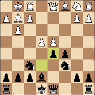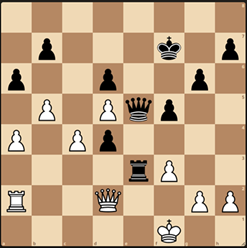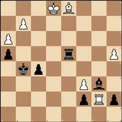 V posledním kole jsme k šachovnici usedli s Milošem Gájem. Věděl jsem, že pokud se chci umístit nějak rozumně, potřebuju ještě zabrat a soupeře nepodcenit. Přesto se mi to povedlo a aktivitu po e sloupci jsem přehnal. Po zásluze jsem byl zahnán zpět na svou polovinu a měla mě čekat náročná koncovka bez pěšce. Soupeř si ale nekrytého izoláka na d4 nedobral, protože se obával mého vpádu dámou na dámské křídlo, který by ve spojení s věží na e sloupci mohl být drtivý. Místo toho mi dovolil nasáčkovat se zpět dopředu a vytvořit krásný řetězec pd6, De5, pd4, Ve3, který je prvním a taky posledním hřebíkem do bílé rakve. Na diagramu mě, prosím, opět neberte za slovo. Nejsem si jistý přesným postavením bílých pěšců, krále a věže. Ti ale v partii žádnou změnu přinést nemohli.