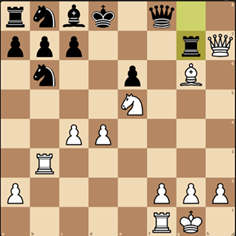 Černá pozice už se drží jen zuby nehty. Soupeř mi to ale ještě usnadnil. 21. …, Vg7? 22. Dh4, De7 (22. …, Ve7 23. Vf3 +-) 23. Dh8 +- A to už je mat druhým tahem.