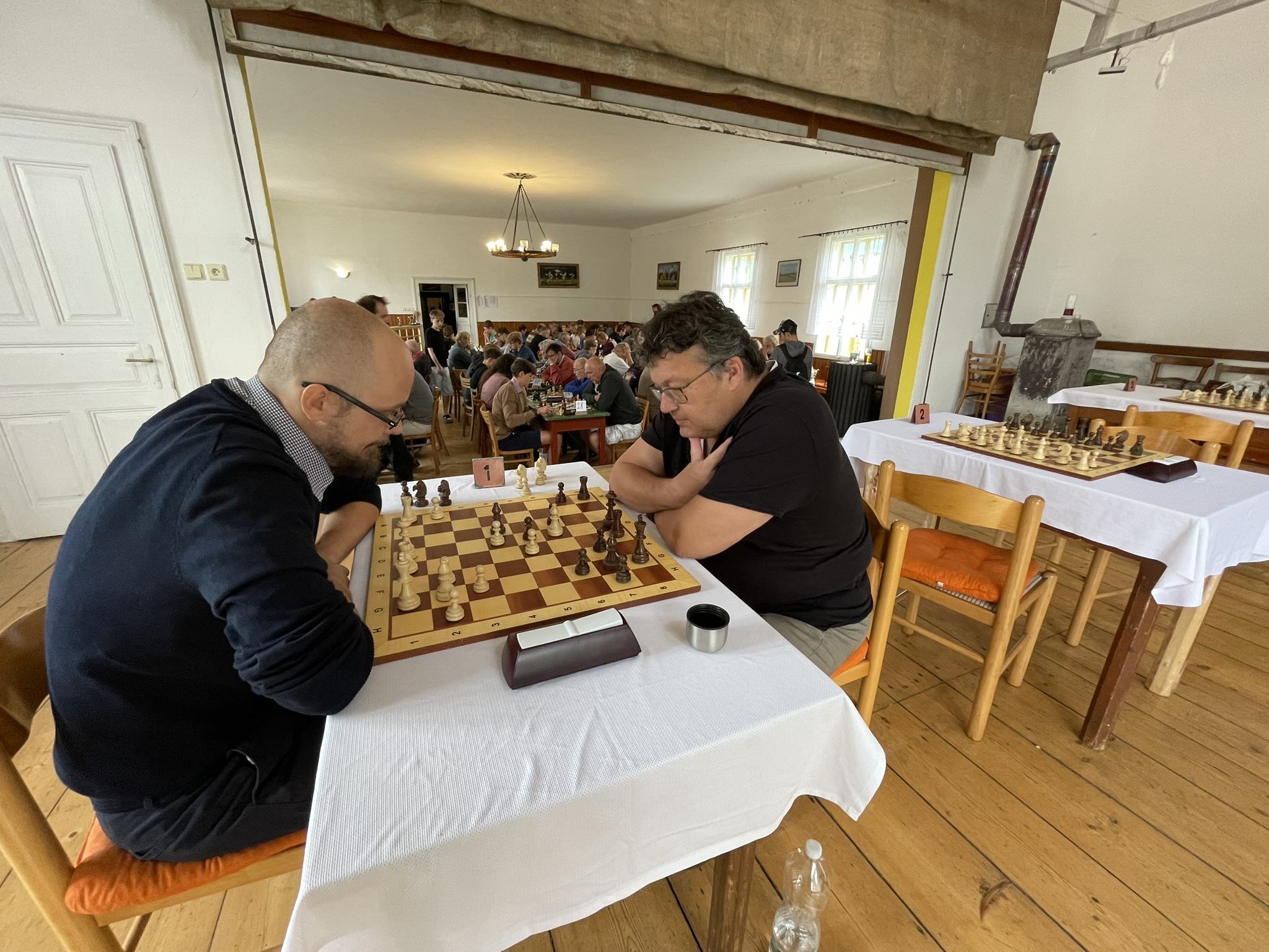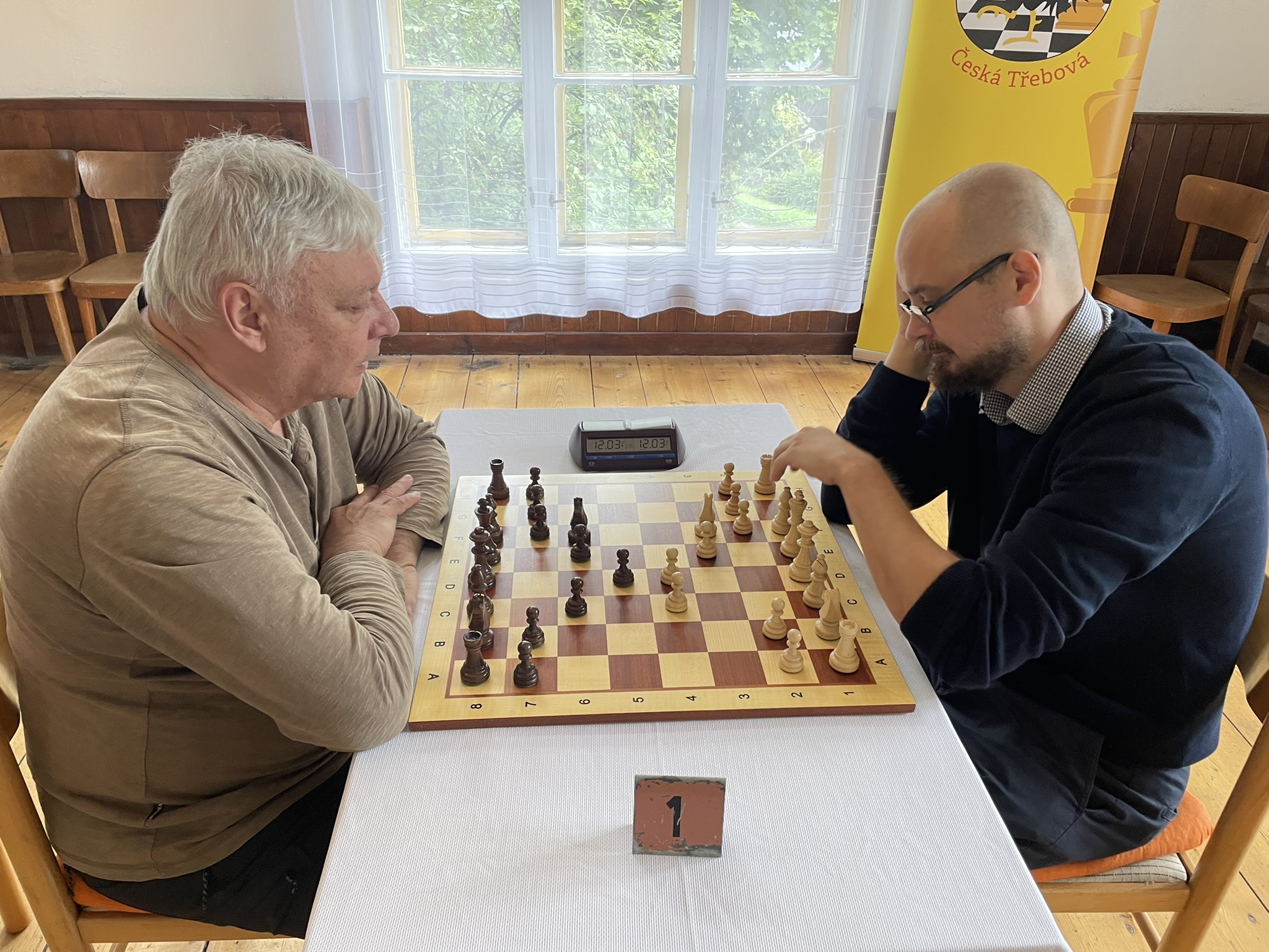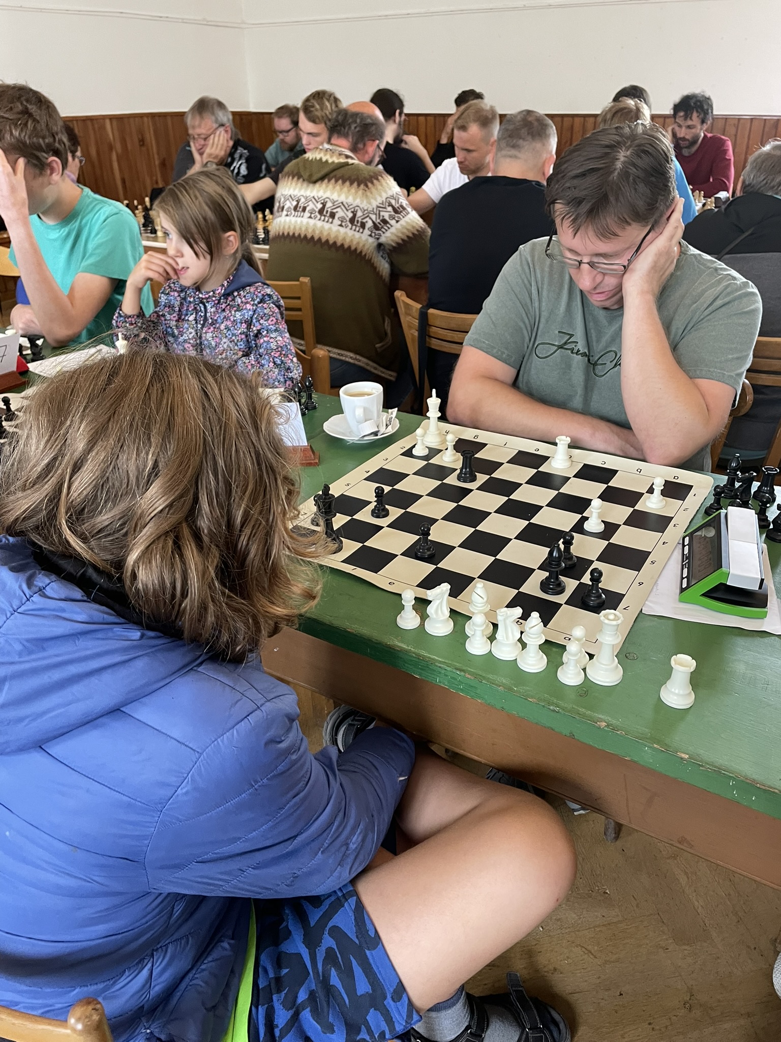 Ještě k mým partiím. V prvním kole jsem Lánu pomalu pozičně přehrával a v době, kdy jsem získával pěšce, on už padal. Jenže se vteřinou na hodinách správně reklamoval, že hodiny nepřidávají, dostali jsme oba tři minuty, on najednou nepadal, já lehkomyslně nepočítal dvě varianty, ale prostě jsem si jednu vybral – a najednou byla úplná symetrie a musel jsem zkoušet na vteřinách soupeře ošidit, což nakonec vyšlo. Jinak jsem obecně soupeře úspěšně sušil na nějakou výhodu v koncovce, akorát s Cimprichem st. jsem přepjal strunu a doplatil na nenápadnou slabinu, a Honza Jiroušek po nepřesnosti v zahájení vysušil mě. Nehrál jsem úplně vepředu se špičkou, přesto to nebylo neúspěšné.