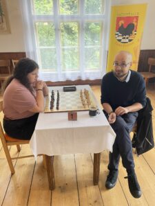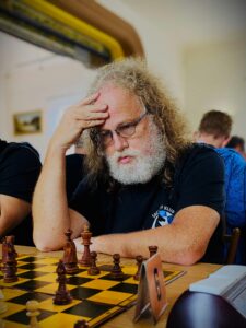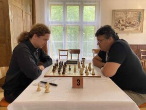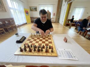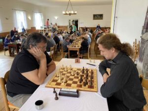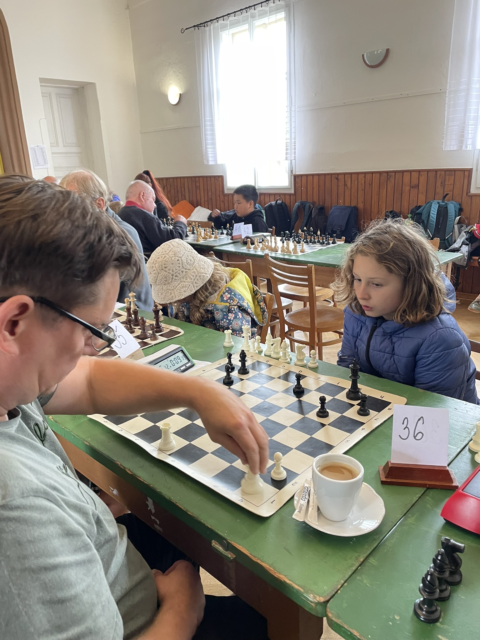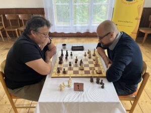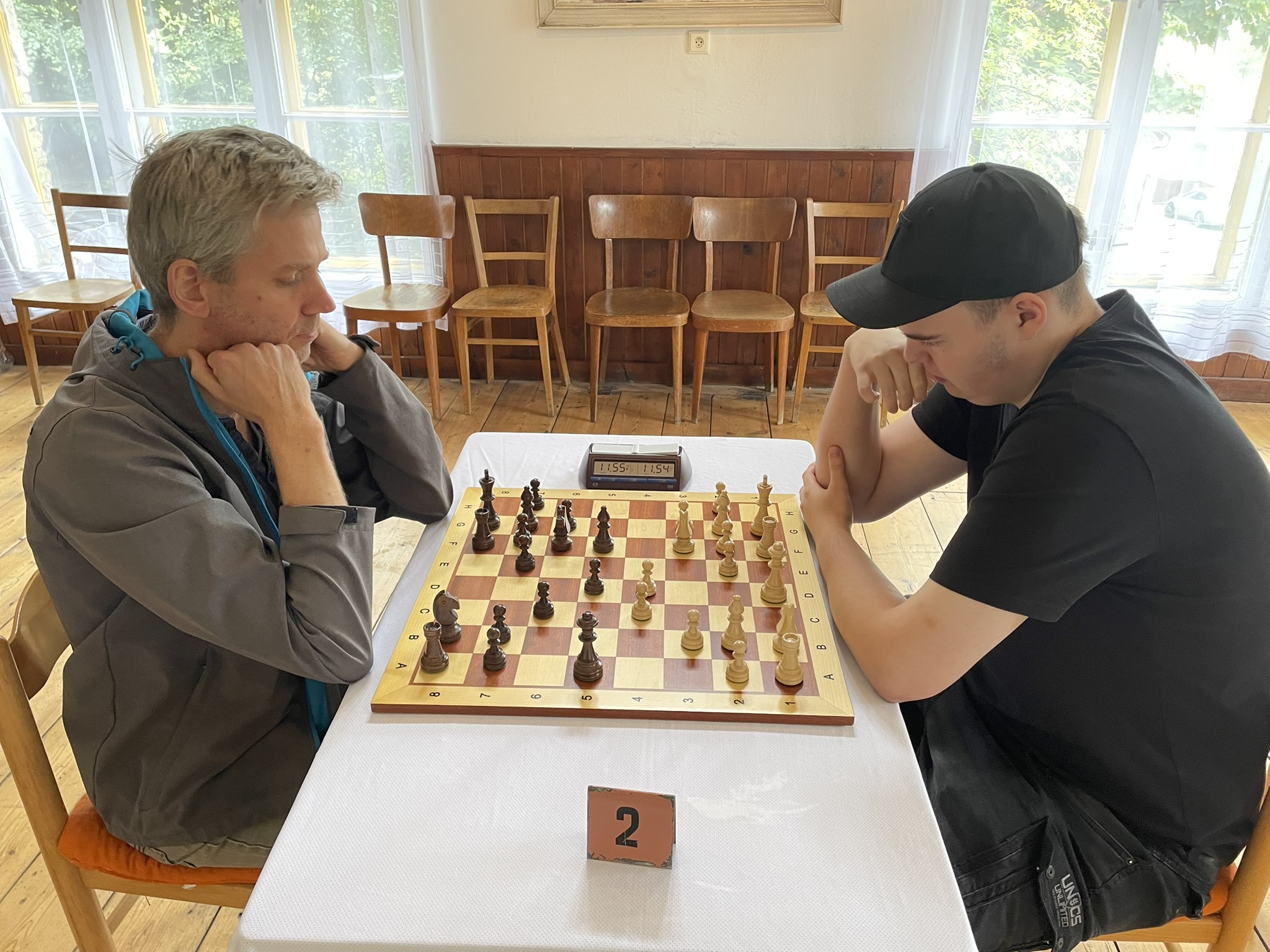 Ještě k mým partiím. V prvním kole jsem Lánu pomalu pozičně přehrával a v době, kdy jsem získával pěšce, on už padal. Jenže se vteřinou na hodinách správně reklamoval, že hodiny nepřidávají, dostali jsme oba tři minuty, on najednou nepadal, já lehkomyslně nepočítal dvě varianty, ale prostě jsem si jednu vybral – a najednou byla úplná symetrie a musel jsem zkoušet na vteřinách soupeře ošidit, což nakonec vyšlo. Jinak jsem obecně soupeře úspěšně sušil na nějakou výhodu v koncovce, akorát s Cimprichem st. jsem přepjal strunu a doplatil na nenápadnou slabinu, a Honza Jiroušek po nepřesnosti v zahájení vysušil mě. Nehrál jsem úplně vepředu se špičkou, přesto to nebylo neúspěšné.