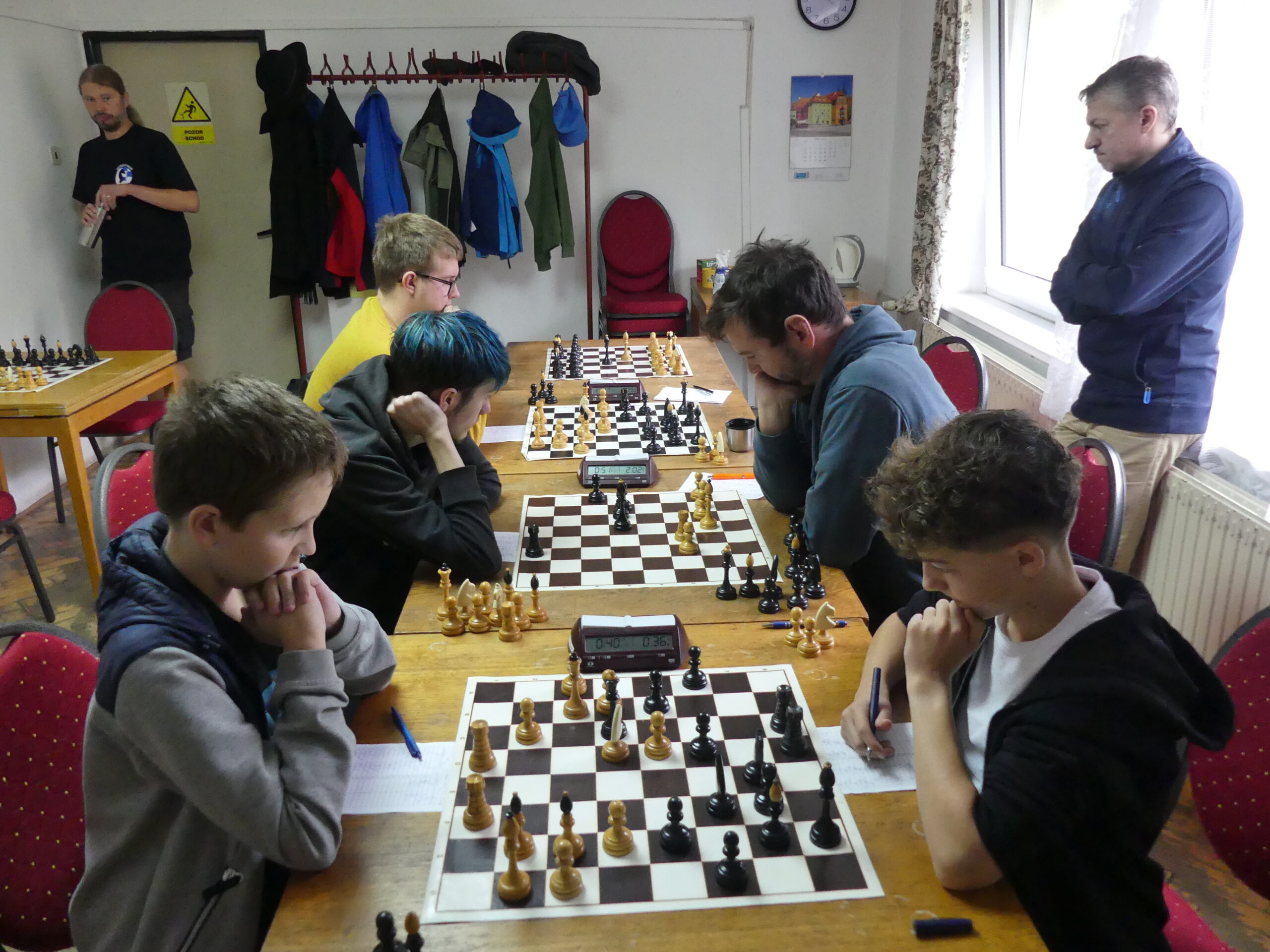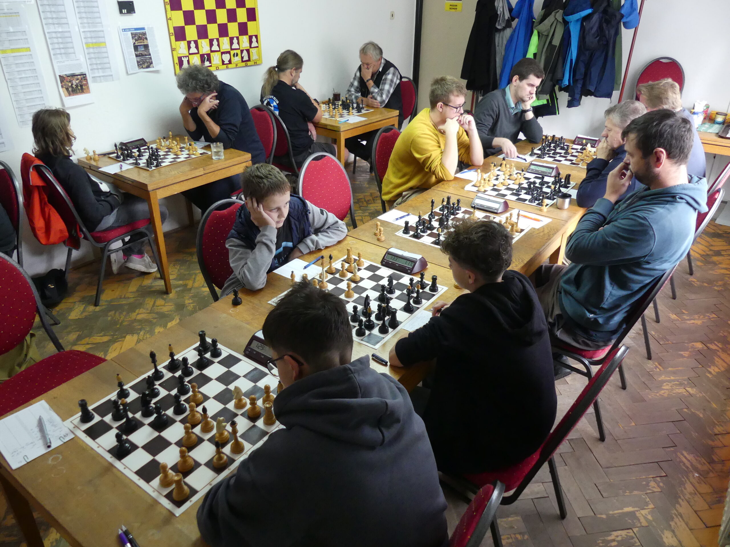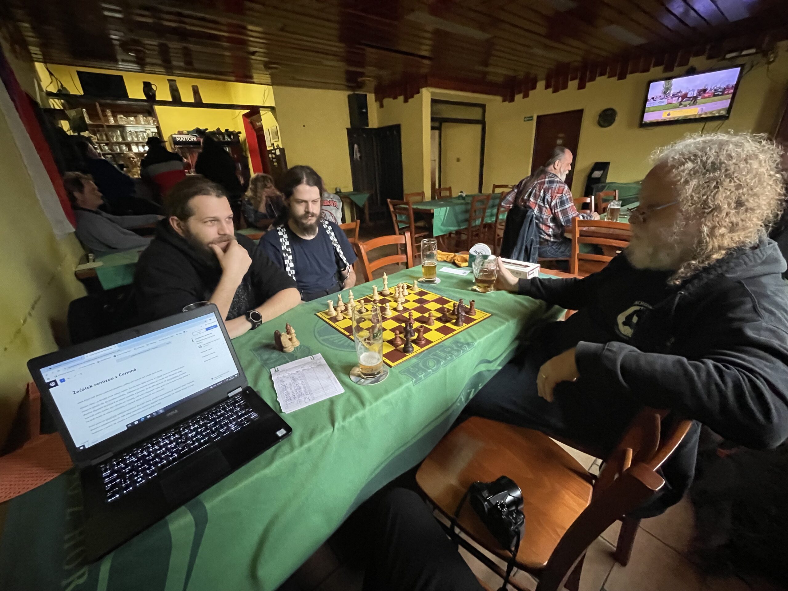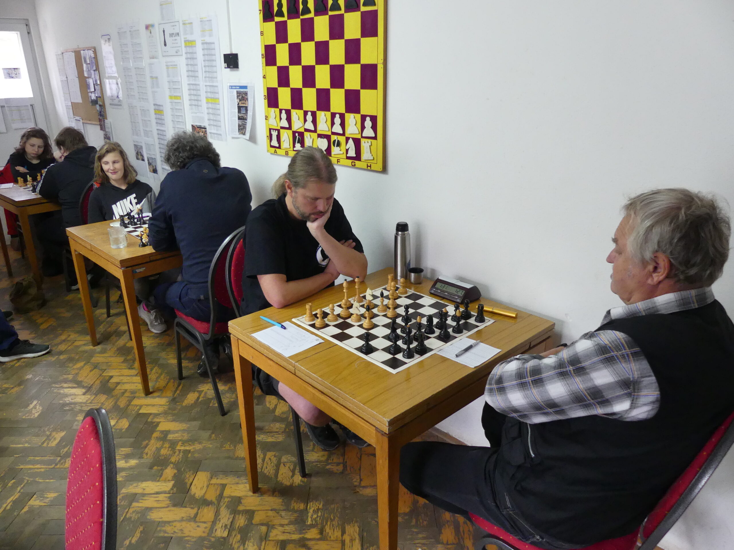 Nejdřív před polednem půlil Marian na šesté bílými – po včerejším maratonu v Lanškrouně v pořádku, soupeř se bránil dobře. Pak k mému zděšení Saša – ale byla to i moje chyba. Vítěznou premiéru zažil těsně po úderu kostelních zvonů Jožka – soupeře fantasticky rozstřílel. V tu chvíli kapitán/zuřivý reportér s lepším časem a močálovou pozicí nabídl půlku, vědom si skutečnosti, že nemáme jedinou horší pozici a na některých jsme lepší. Než ji ale soupeř vzal, nepěkně se to jediným tahem otočilo u Toma na páté a za už vyrovnaného stavu začal tápat i Petr – soupeř blical na minutě asi od 10. tahu a zjevně mu to vyhovovalo. Vzal tedy raději půlku. Dohrávaly se dvě partie, na třetí se Ondra propracoval z lepší pozice do horší, ale remízové věžovky, na čtvrté stál Matěj od oka líp, ale stálo ho to čas. Hejdič pak přijal remízovou ponuku – po požehnání kapitánově – a za stavu 3,5 se o majiteli bodu/ů rozhodovalo na čtvrté. Kluci makali i po časovce, Matěj měl pořád plusfloka, ale zesílení nevidno. Proto po poradě s kapitány zapůleno na nakonec spravedlivých 4:4.