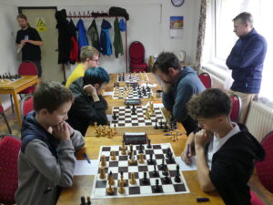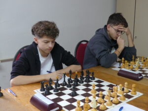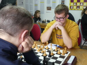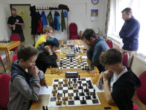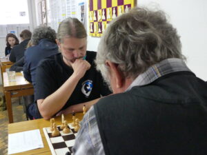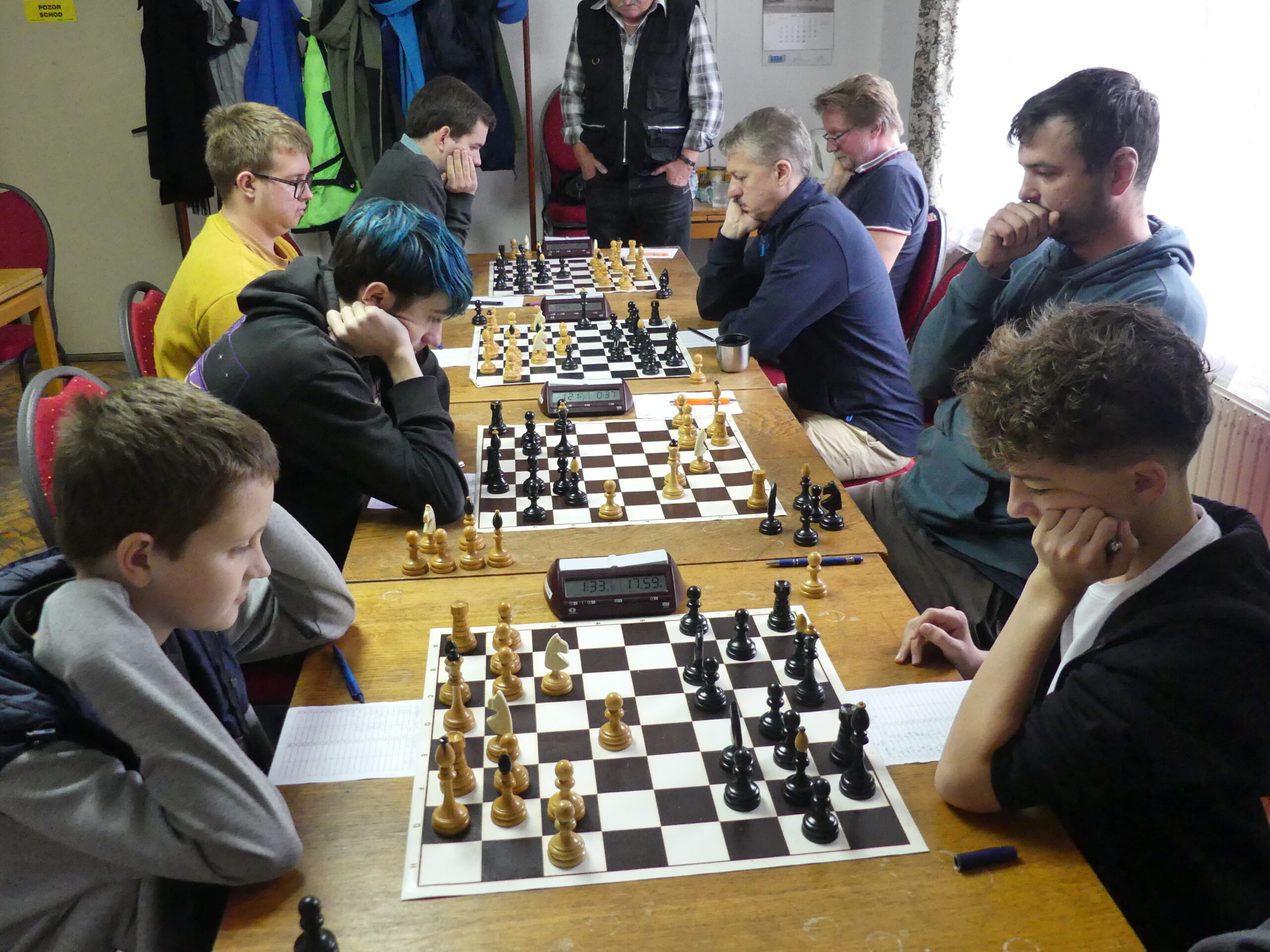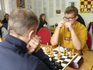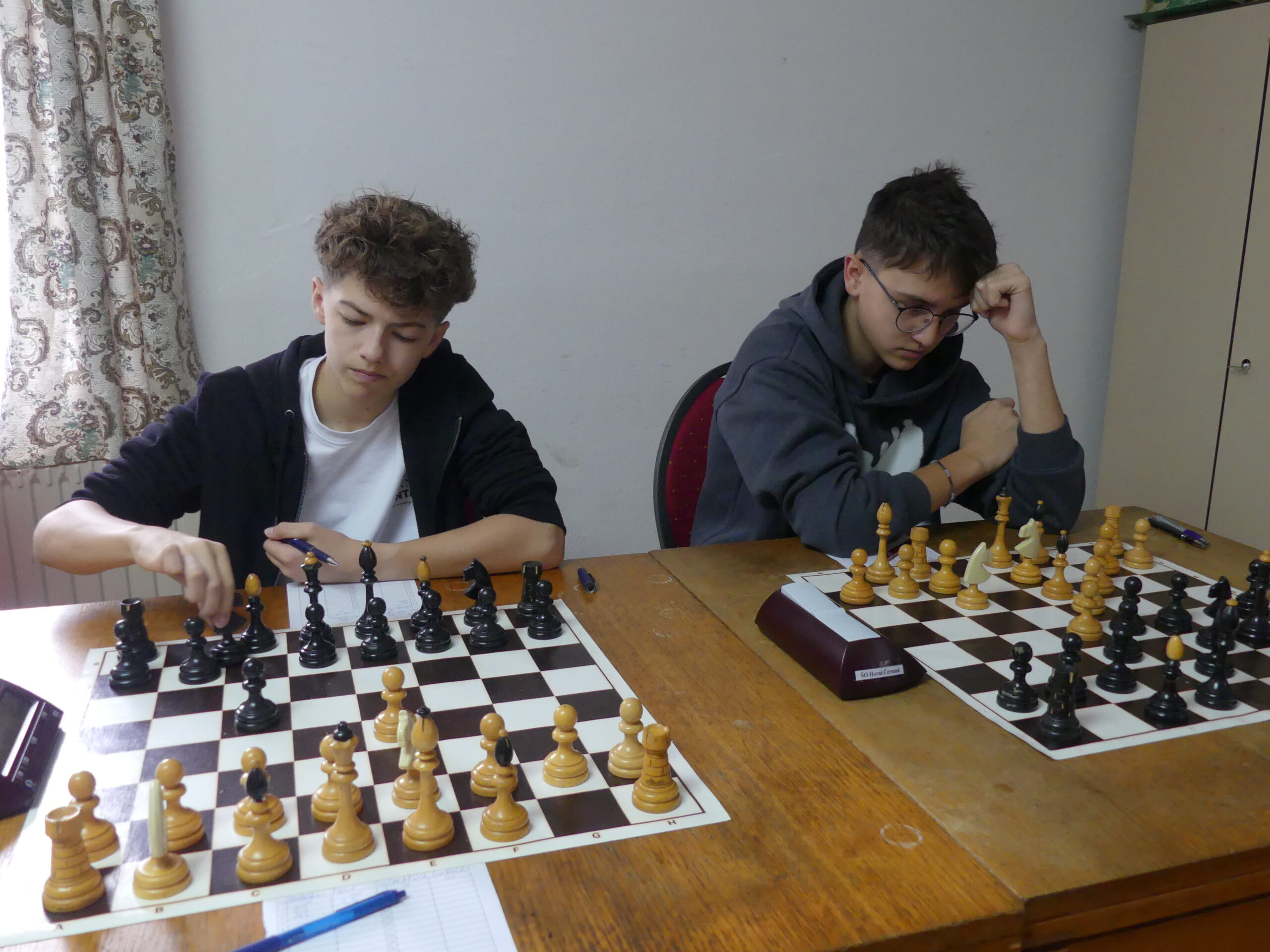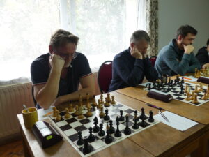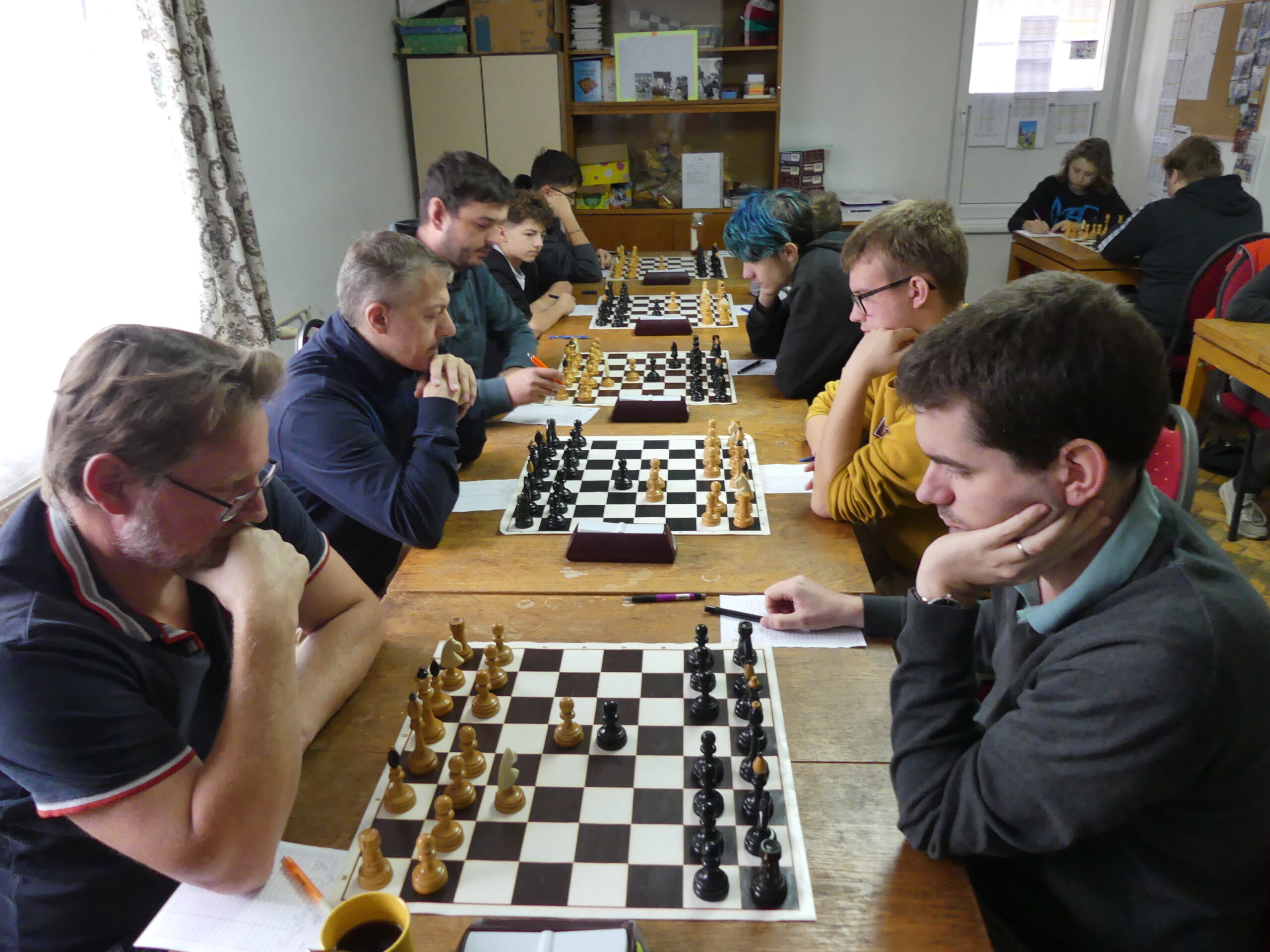 Nejdřív před polednem půlil Marian na šesté bílými – po včerejším maratonu v Lanškrouně v pořádku, soupeř se bránil dobře. Pak k mému zděšení Saša – ale byla to i moje chyba. Vítěznou premiéru zažil těsně po úderu kostelních zvonů Jožka – soupeře fantasticky rozstřílel. V tu chvíli kapitán/zuřivý reportér s lepším časem a močálovou pozicí nabídl půlku, vědom si skutečnosti, že nemáme jedinou horší pozici a na některých jsme lepší. Než ji ale soupeř vzal, nepěkně se to jediným tahem otočilo u Toma na páté a za už vyrovnaného stavu začal tápat i Petr – soupeř blical na minutě asi od 10. tahu a zjevně mu to vyhovovalo. Vzal tedy raději půlku. Dohrávaly se dvě partie, na třetí se Ondra propracoval z lepší pozice do horší, ale remízové věžovky, na čtvrté stál Matěj od oka líp, ale stálo ho to čas. Hejdič pak přijal remízovou ponuku – po požehnání kapitánově – a za stavu 3,5 se o majiteli bodu/ů rozhodovalo na čtvrté. Kluci makali i po časovce, Matěj měl pořád plusfloka, ale zesílení nevidno. Proto po poradě s kapitány zapůleno na nakonec spravedlivých 4:4.