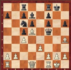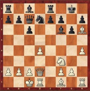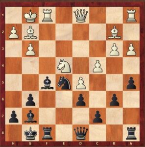 Do posledního kola jsem byl bojovně naladěn, hráli jsme o celkové prvenství, navíc jsem bílými postavil dobře známou pozici s prostorem. A vůbec mi nedošlo, jaká zrada se v ní skrývala. Na nenápadný tah Dc8! jsem úplně automaticky a bez rozmyslu zareagoval Kh2?? (nutné bylo h4 nebo braní na c6 a nic se nedělo) a soupeř po výměně na d4… naštěstí stejně automaticky pokračoval Sc6?? Po Jg4+ (které přišlo o tah později) jsem šel okamžitě na párek. Pak už to z roviny nevybočilo. Poučení: nehrajte zahájení automaticky, kontrolujte tahy!