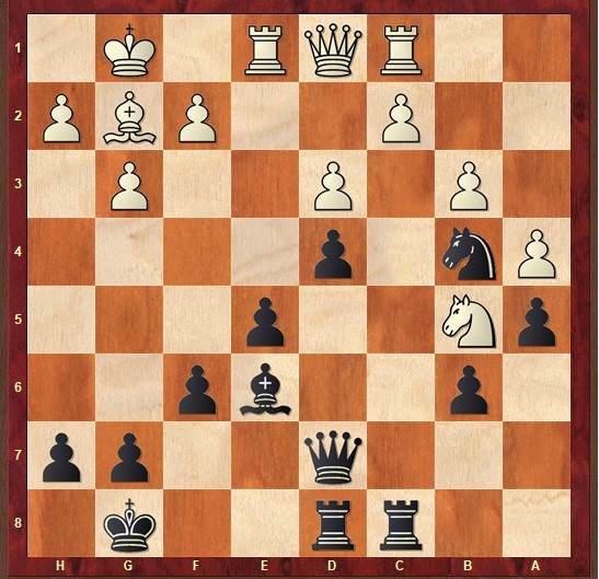 Tohle mě mrzí nejvíc, asi se mi jen tak nepoštěstí přehrát černými hráče pomalu 2300. V pozici na diagramu s výhodou skoro +2 jsem po Ja2 opakoval tahy, protože Majda vyhrál a cenné zápasové vítězství by bylo naše. Jenže Ruda napotřetí neuhnul na a1, nýbž statečně na b1… a já to dokázal ještě prohrát!