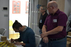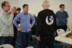 V symetrické anglické hrál Martin velmi dobře a já neměl skoro ani stín výhody. Bylo přitom nutné počítat různé materiální transformace, ale do žádné jsme nešli. Přesto jsem se dvojicí střelců soupeře před kontrolou zmáčkl … a po kontrole zase vypustil. Partie však končí až podepsáním partiářů, další záchvěv mé aktivity už černý neustál a pozice se mu zhroutila. 1:0