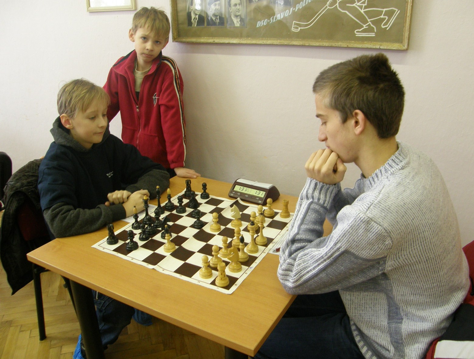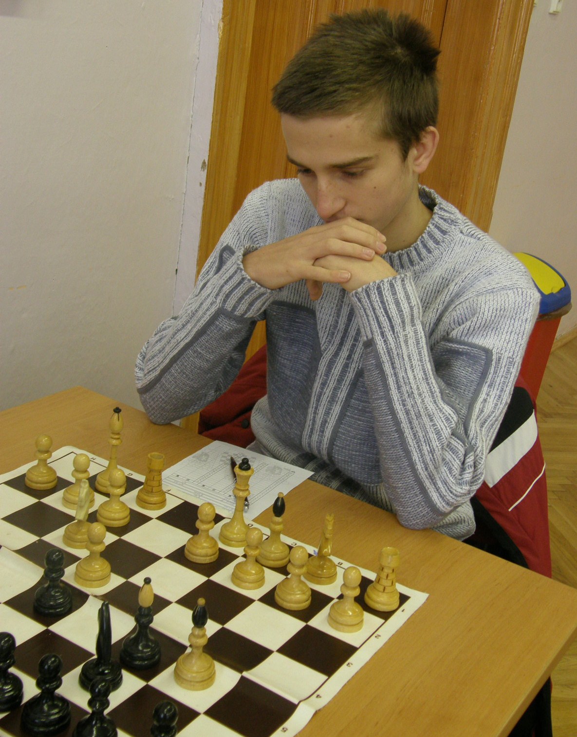 O to větší překvapení nám chystá návrat do sokolovny, kde kluci ukazují podepsaný zápis s výsledkem 5:3 v náš prospěch! Načal to neomylně Štěpán Sergej Blaško, který učinil přítrž stoprocentní bilanci Davida Siona. Hrála se jedna z hlavních variant +2700 ve slovanské (Sergej: „Sem to převedl do karokanu… počkat, tohle je jako teorie?! :-), z níž po zahájení vylezl trochu lépe (průlom e5!) spíše náš válec. Poté došlo k jakési kombinační přestřelce, jejímž výsledkem byla výše psaná koncovka, kde oustecká technika nezradila. Sergej se pyšní skvělou bilancí 4,5/5 a první z Lanškrouňáků se má z kraje února nač těšit!