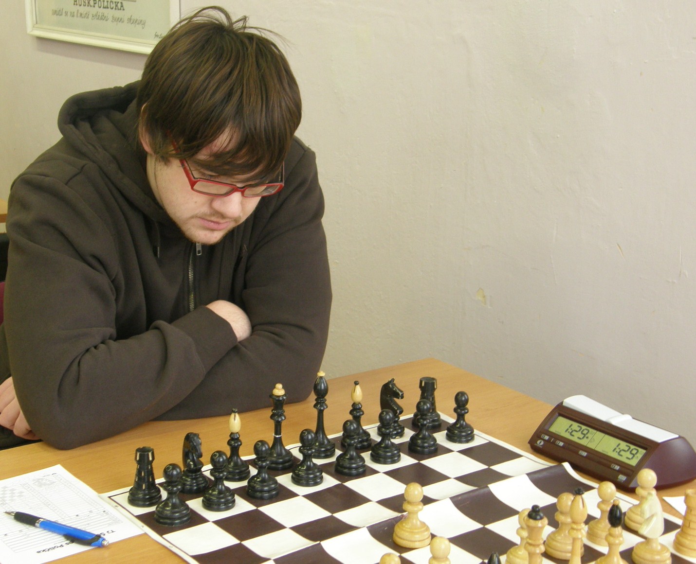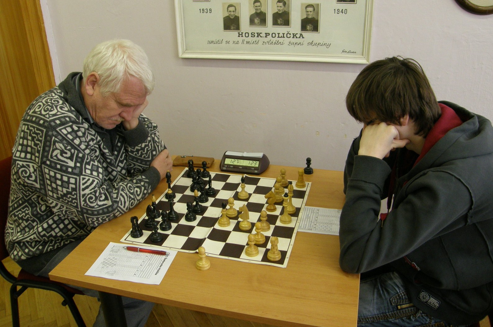 Kdo si naopak vynikající bilanci v Poličce pokazil, byl kapitán Honza Smola. S dalším z početné juniorské eskadry Kamilem Petráskem rozehrál obligátní skandinávskou, čekal jsem obvyklé oustecké nudašachy zakončené bodem v nicmockoncovce. Jenže ouha: domácí mladík zafixoval černému slabinu na c6 kobylou o pole před a aktivně naskládal figury. Co Smolda přehlédl, netuším, viděl jsem až výsledek na zápisu, kterýžto opatroval domácí nestor pan Houška. Poličské béčko poprvé skóruje a snižuje ze svého pohledu na 1:3.