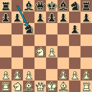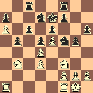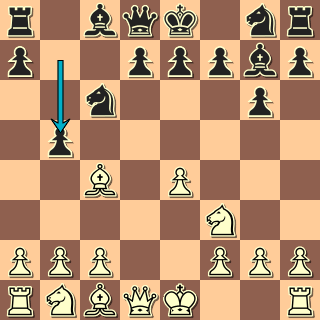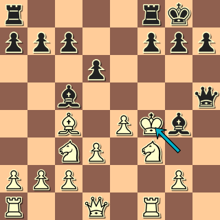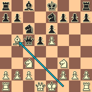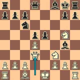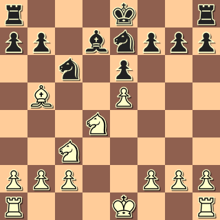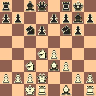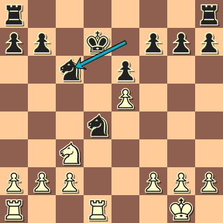9. … Jb4 To není špatné. Dobré je i 9. … h6. Velmi zajímavé je 9. … e4!, ale černý musí vidět, že po 10. Jxe4!! nelze brát dxe4?? pro smrtící šach dámou z b3 nebo c4, ale 10. … Sf5! nebo 10. … De8(e7) dostává bílého do rozhodující vazby. 10. De3?? Chyba, která by se ve vážné partii stávat neměla. Jxc2+ A je po partii, dál to nemá cenu ukazovat, ale ještě hezký závěr: