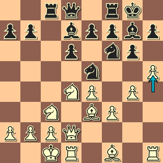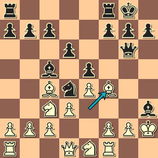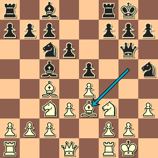 Úplně normální pozice otevřených her, černý musí 11. … Sxf3 a po 12. Dxf3 nejlépe Jd7 s výměnou svého špatného střelce. 11. … Se6? Drží dvojici střelců, ale ztrácí veledůležitého centrálního pěšce. 12. Jxe5 Dd4? Dáma se zbytečně zatoulá. Chtělo to nějaké 12. … Ve8, ale černý má málo možností, bez pěšcového centra to nejde. Lákavé je 12. … Jxe4!?, ale po 13. Sxe7 Jxc3 14. Sxd8 Jxd1 15. Sxc7 Jxb2 16. Vab1 zůstane bílému výhoda. 13. Jf3 Db4 14. Dd2 Dxb2? Typické pikožroutství: zatímco bílý si sebral pěšce v centru, černá bere se ztrátou času na křídle, to nemůže být rovnocenná náhrada! 15. e5!? Počítá dobře; ještě jemnější bylo 15. a3!! s hrozbou chycení dámy a teprve po 15. … Db6 16. e5. Černý střelec by pak neměl pole b4 jako v níže uvedené variantě.
