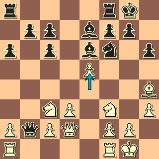 Další francouzská pozice sehraná jakžtakž, ale opět už s převahou černého, který má se svým zahájením rozhodně více zkušeností. Teď však zahrál zbrklou chybu: 9. … d4? 10. Dxd4! (10. Jxd4? Dxe5+) 10. … Dxd4 11. Sxd4 Sd7