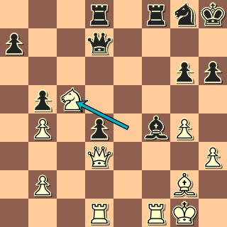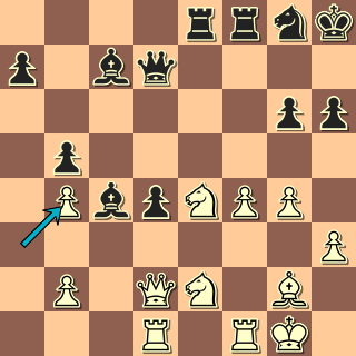 Připadám si trochu trapně, já asi nejsem ten, kdo by měl otazníkovat Mariana :-), ale dávat v takové pozici dvojici střelců a hlavně černá pole (e3), no nevím. 24. … cxd3 Forsírovat nebylo nutné, bylo možné nechat pěšce stát a držet napětí, ale i vzhledem k Marianovu času to jde; Martin vidí kořist a tlačí se vpřed. 25. Dxd3 Sc4 26. Dd2 Jxb4 27. axb4