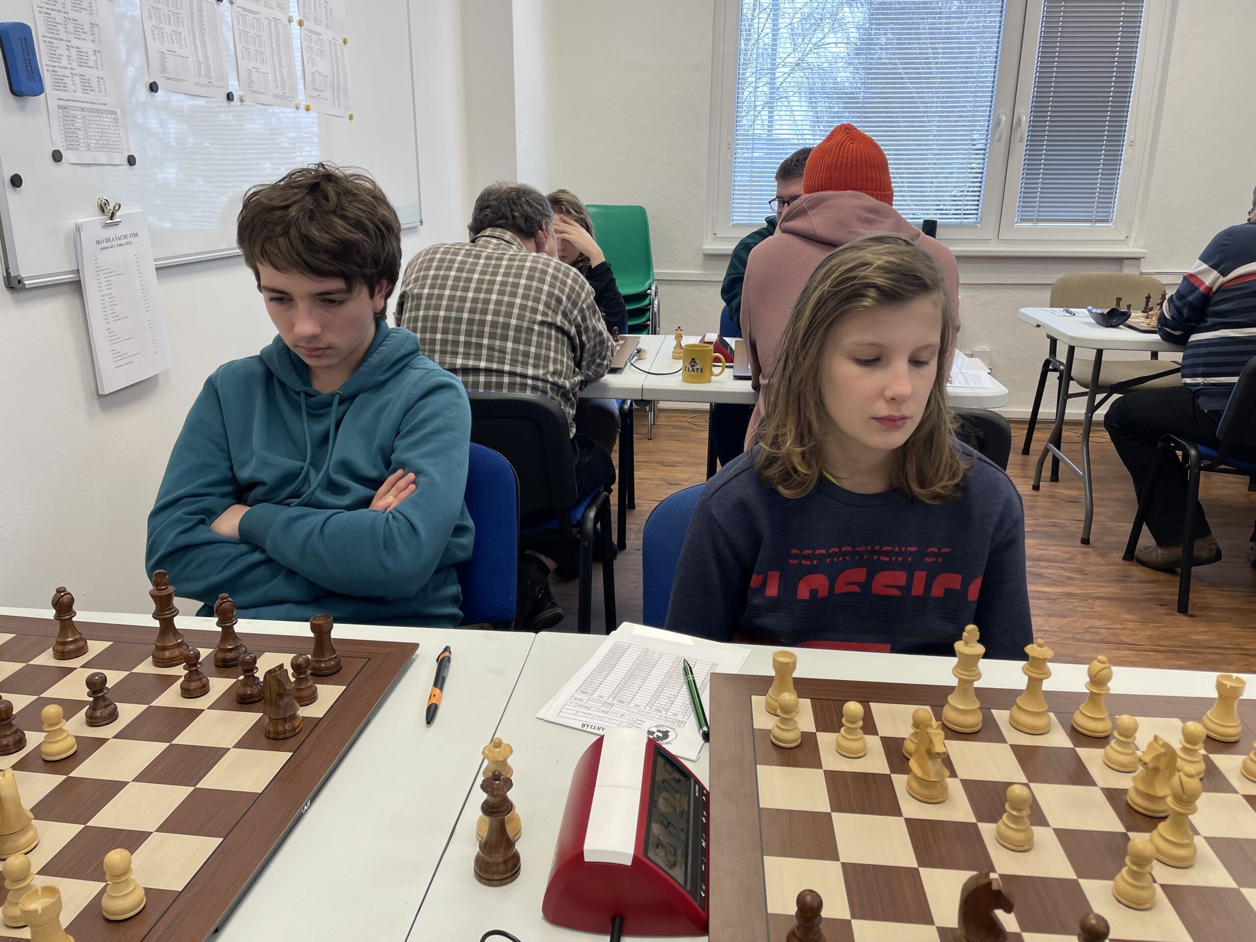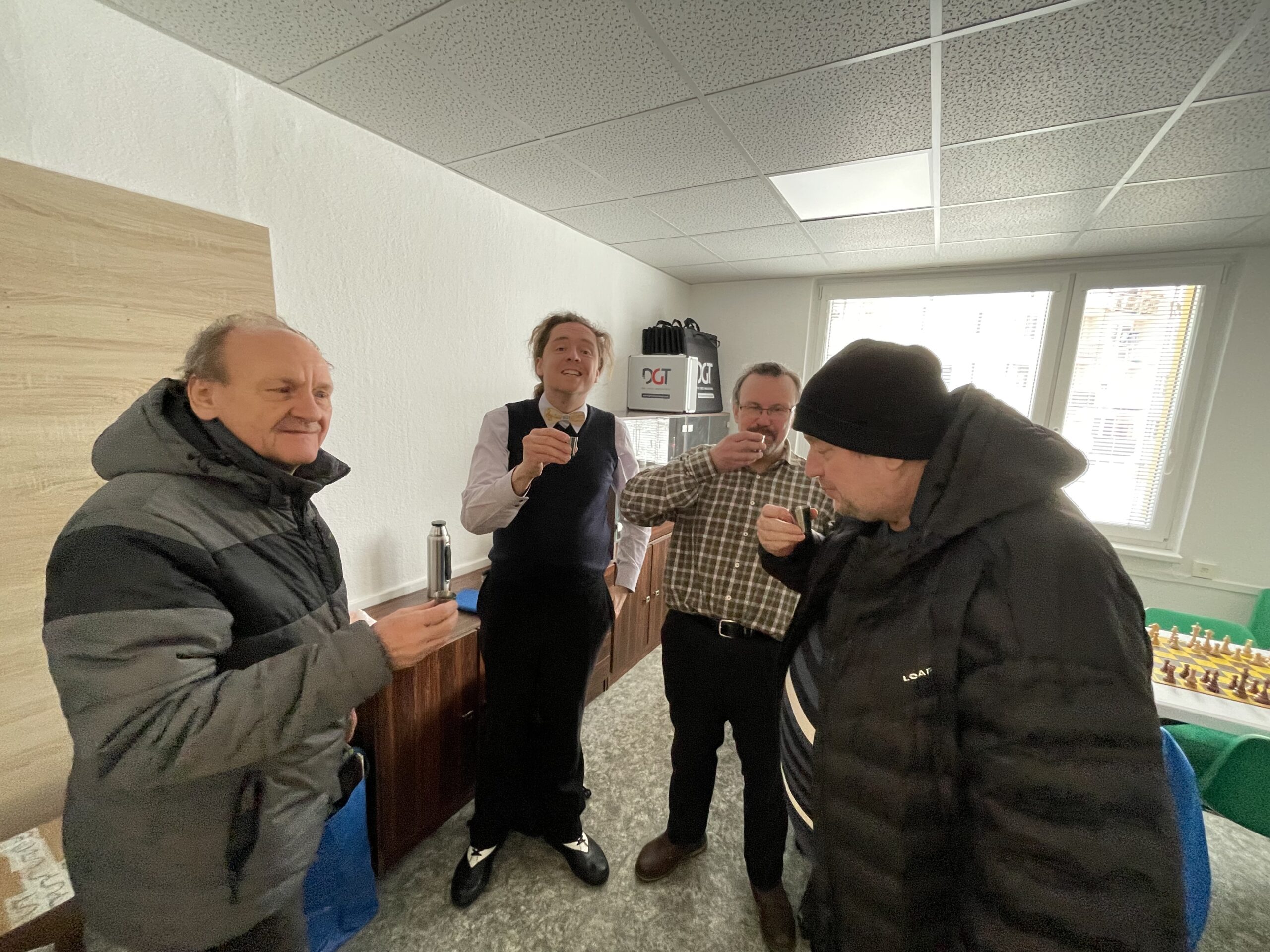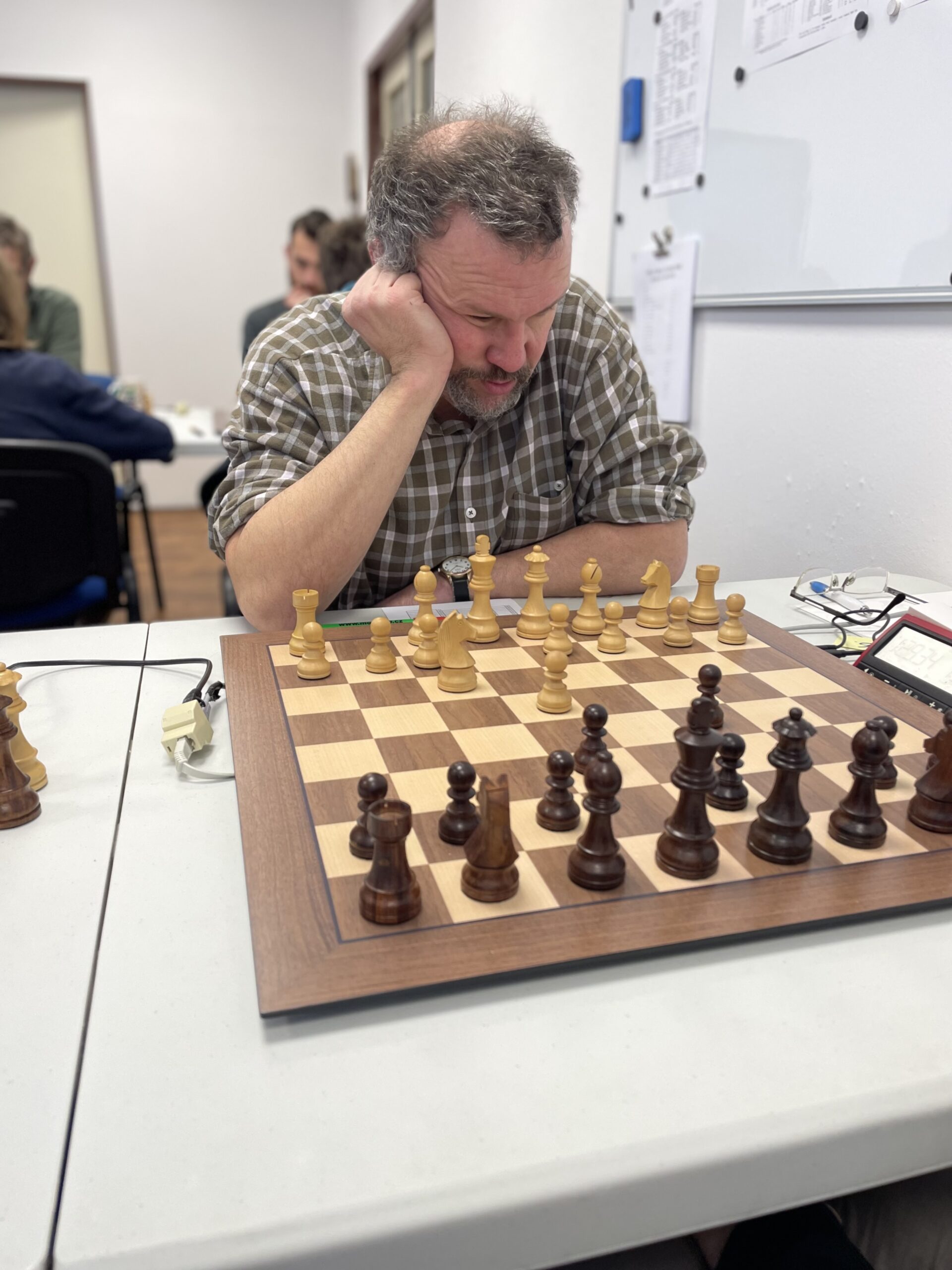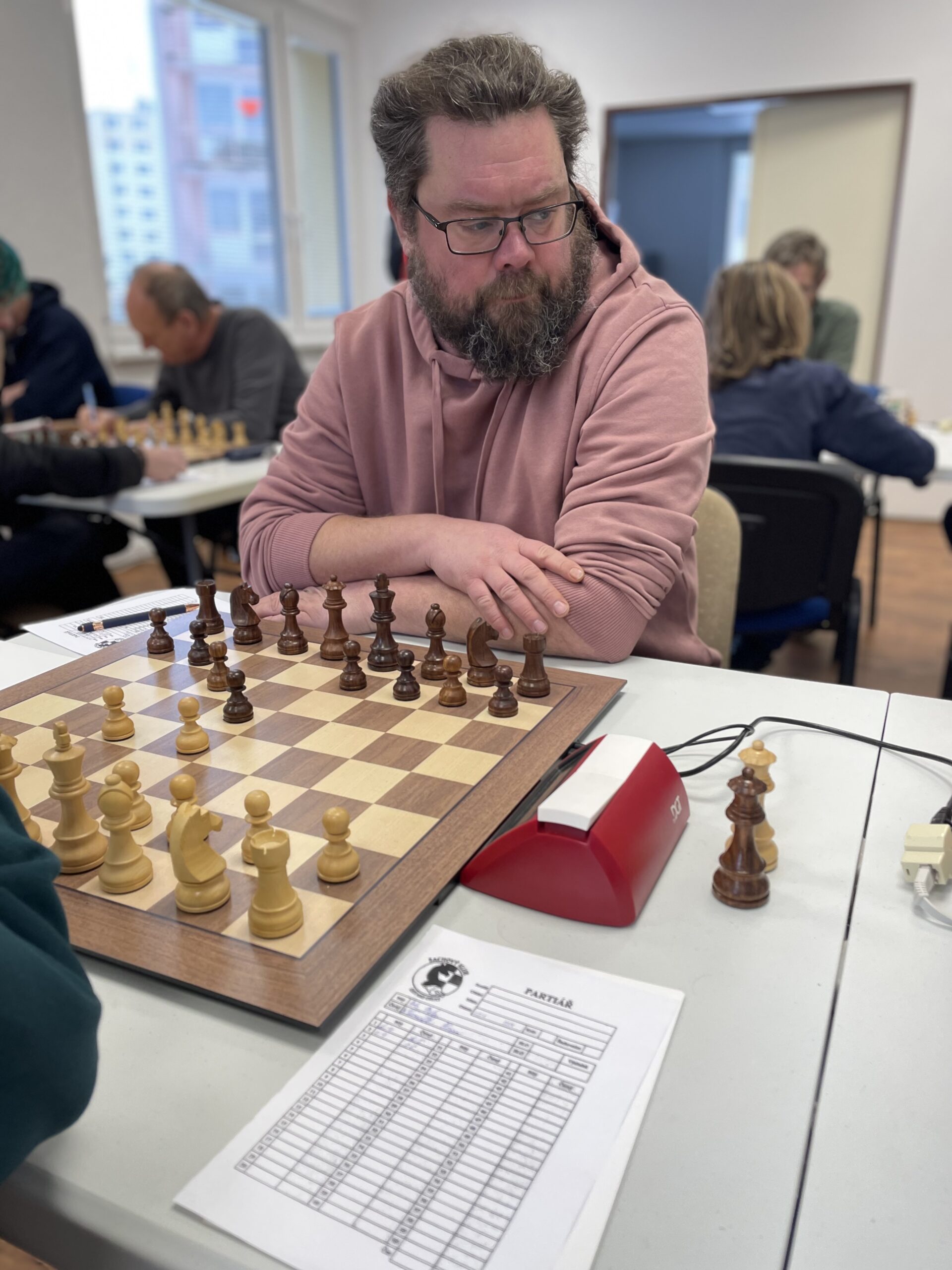 Přivítání, Martin Šmajzr nahodil onlajny a jdeme na věc! Zápas od gongu bojovný, první to zkusil zapůlit až Pavel Kylar před polednem, ale náš junior chtěl hrát. Na první desce nahradil rozpaky optimismus, můj soupeř dovedně vymýšlel. Na třetí určitě nejsme horší, na čtvrté hoříme míň než obvykle. Matěj pomalinku zesiluje, Marian hurá útok odráží a směřuje do vyhrané koncovky. Saša hraje oboustranně prapodivnou partii na aktivitu a Skubík v klidu postavil zavřenou Francii.